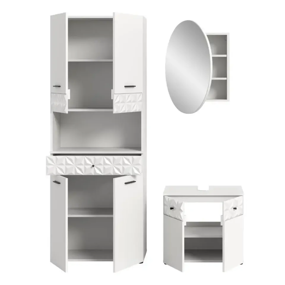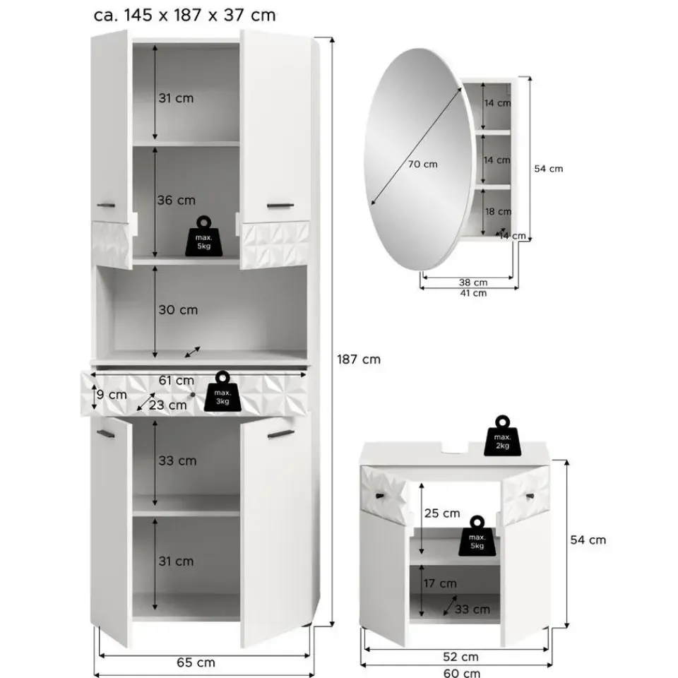 Prisma badkamer wit. Zonder wastafel. Deze badkamerkast (B/H/D 176x187x37 cm) in wit melamine combineert modern design met hoge functionaliteit en duurzaam vakmanschap. Perfect voor het creëren van een stijlvolle badkamer. Productdetails: Afmetingen: Deze badkamerkast meet 176x187x37 cm en biedt voldoende opbergruimte. Hij is ideaal voor middelgrote tot grote badkamers. Design: De moderne witte melamine fronten creëren een heldere en tijdloze look die uw badkamer gastvrij en uitnodigend maakt. De zwarte metalen handgrepen voegen een elegante touch toe. Materiaal: Dit meubel is gemaakt van FSC®-gecertificeerd houtmateriaal en staat voor duurzame en milieubewuste productie. Eenvoudig te reinigen en duurzaam: Hoogwaardige materialen zorgen voor eenvoudige reiniging en een lange levensduur – ideaal voor dagelijks gebruik. Deze stijlvolle badkamerkast brengt orde en elegantie in uw badkamer en ondersteunt tegelijkertijd een duurzame levensstijl. Combineer modern design met praktische functies en creëer een persoonlijke oase in huis!