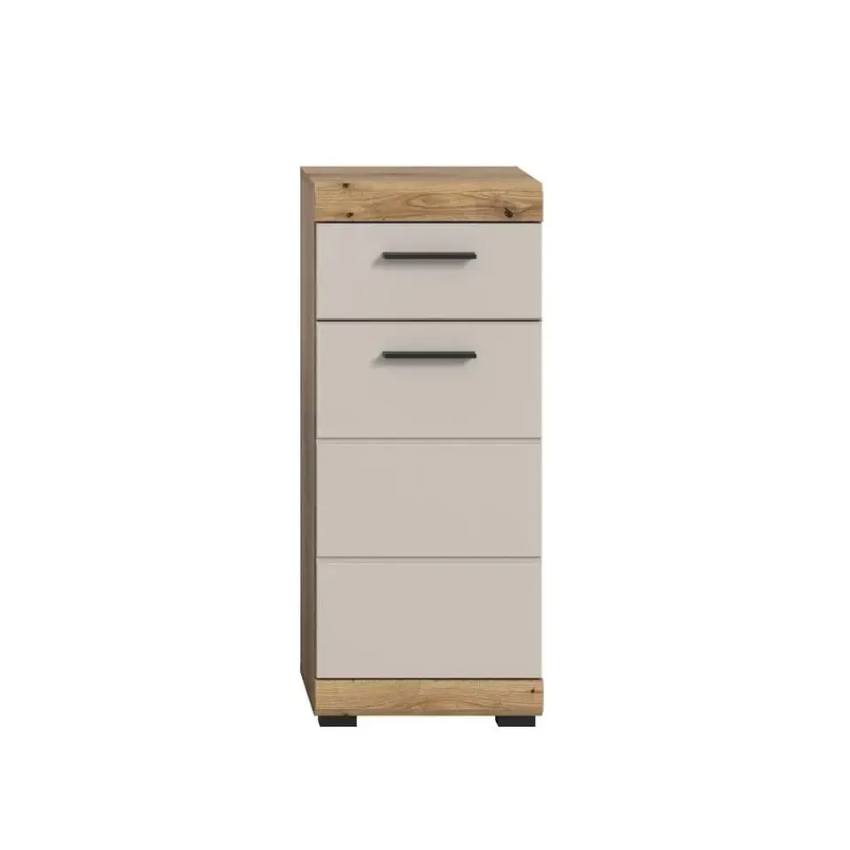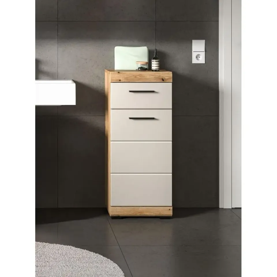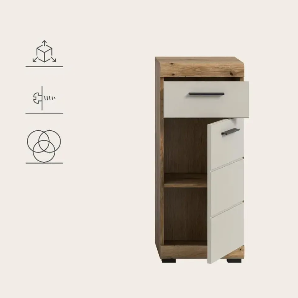 Scout badkamerkast 1 deur, 1 lade kasjmier decor mat, eiken decor. Deur omkeerbaar. Lade volledig uittrekbaar. Deze compacte vrijstaande kast in mat Evoak eikenhout en kasjmier afwerking (37 x 88 x 31 cm) biedt veelzijdige opbergmogelijkheden in een kleine ruimte met één deur, één lade, één in hoogte verstelbare plank en twee compartimenten. Het onderhoudsvriendelijke MDF front met gefreesde groef is van hoge kwaliteit en zorgt voor een moderne en elegante uitstraling. Het omkeerbare deurscharnier maakt flexibele plaatsing van de kast in uw woning mogelijk. Dit meubelstuk is ideaal om orde te scheppen en tegelijkertijd een stijlvolle touch toe te voegen. De robuuste constructie garandeert duurzaamheid en stabiliteit. Met deze vrijstaande kast brengt u design en functionaliteit in uw woonkamer of badkamer.