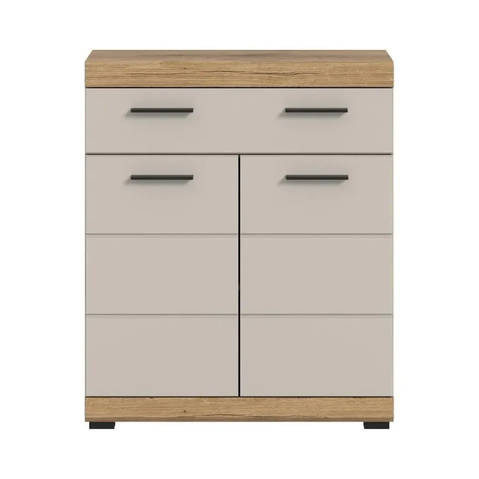 Scout badkamerkast 2 deuren, 1 lade kasjmier decor mat, eiken decor. Lade volledig uittrekbaar. Deze ruime vrijstaande kast in mat Evoak eikenhout en kasjmier afwerking (74 x 88 x 31 cm) heeft twee deuren, een lade, een verstelbare plank en twee compartimenten. Het onderhoudsvriendelijke MDF front met gefreesde groef is van hoge kwaliteit en geeft het meubel een elegante en moderne uitstraling. De omkeerbare deurscharnieren zorgen voor een flexibele aanpassing aan uw interieur. Met voldoende opbergruimte en een stevige constructie is deze kast ideaal om orde te scheppen en een vleugje stijl toe te voegen aan uw huis. De combinatie van design en functionaliteit maakt het een veelzijdig meubelstuk dat geschikt is voor verschillende woonruimtes.