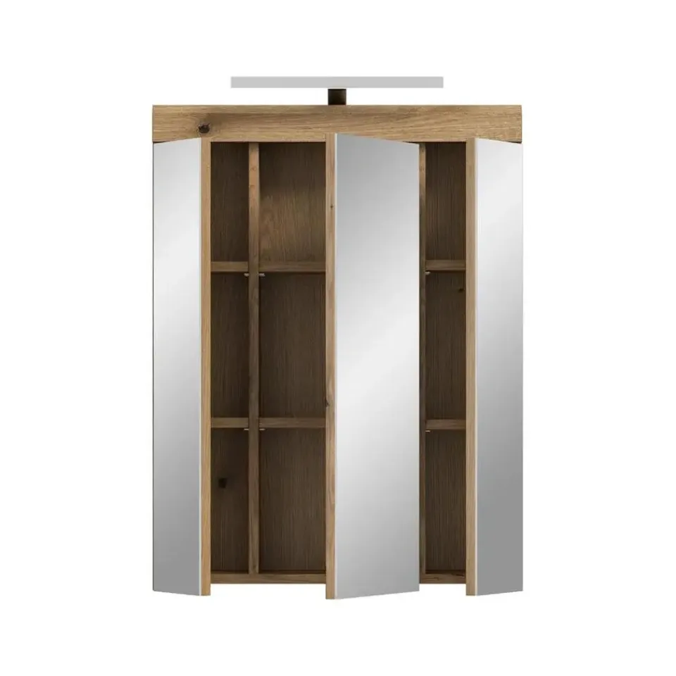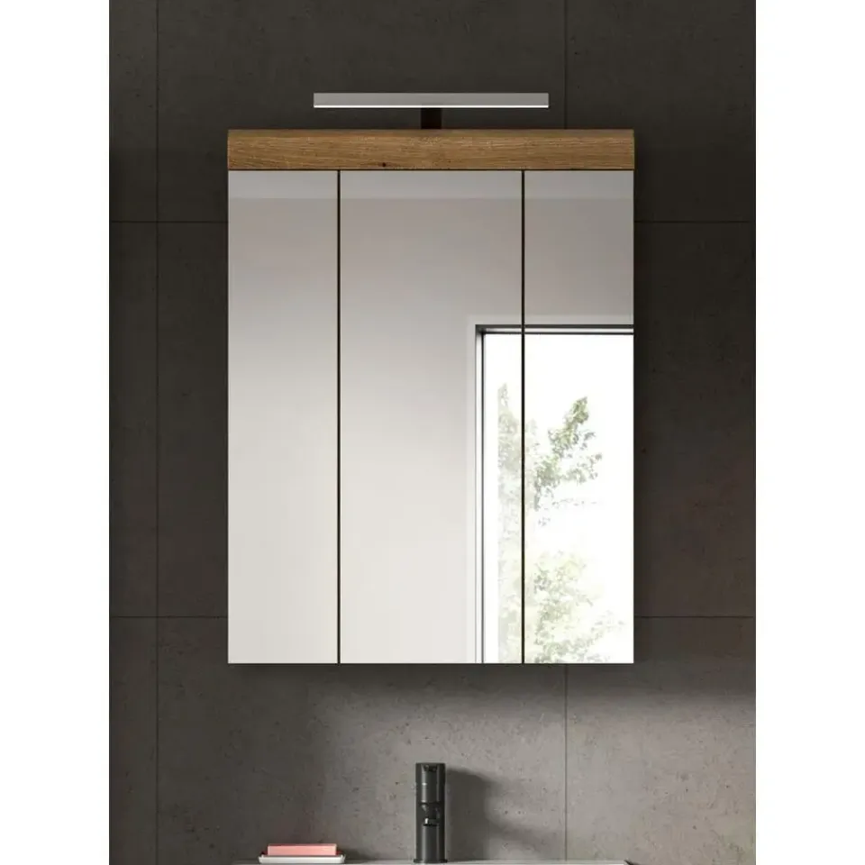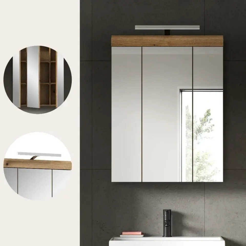 Scout spiegelkast inclusief verlichting 3 spiegeldeuren eiken decor. Deur omkeerbaar. LED. 6 kWh/1000h. 400 Lumen. 6 Watt. 30.000 uur. Kelvin 5000. EEF: G. LED kan niet worden vervangen. Deze tweedelige combinatie van een spiegelkast en badkamerlamp in Evoak Oak-afwerking en spiegelglas (60 x 79 x 18 cm) combineert praktische opbergruimte met stijlvolle verlichting. De spiegelkast heeft een eenvoudig te reinigen front van hoogwaardig spiegelglas dat uw badkamer een moderne uitstraling geeft. De geïntegreerde badkamerlamp zorgt voor optimale verlichting bij het maken van make-up of scheren. Met negen gesloten vakken en zes in hoogte verstelbare planken biedt de kast voldoende ruimte voor cosmetica en toiletartikelen. De robuuste constructie garandeert duurzaamheid. Deze combinatie is de ideale keuze voor een functionele en stijlvolle badkamer.