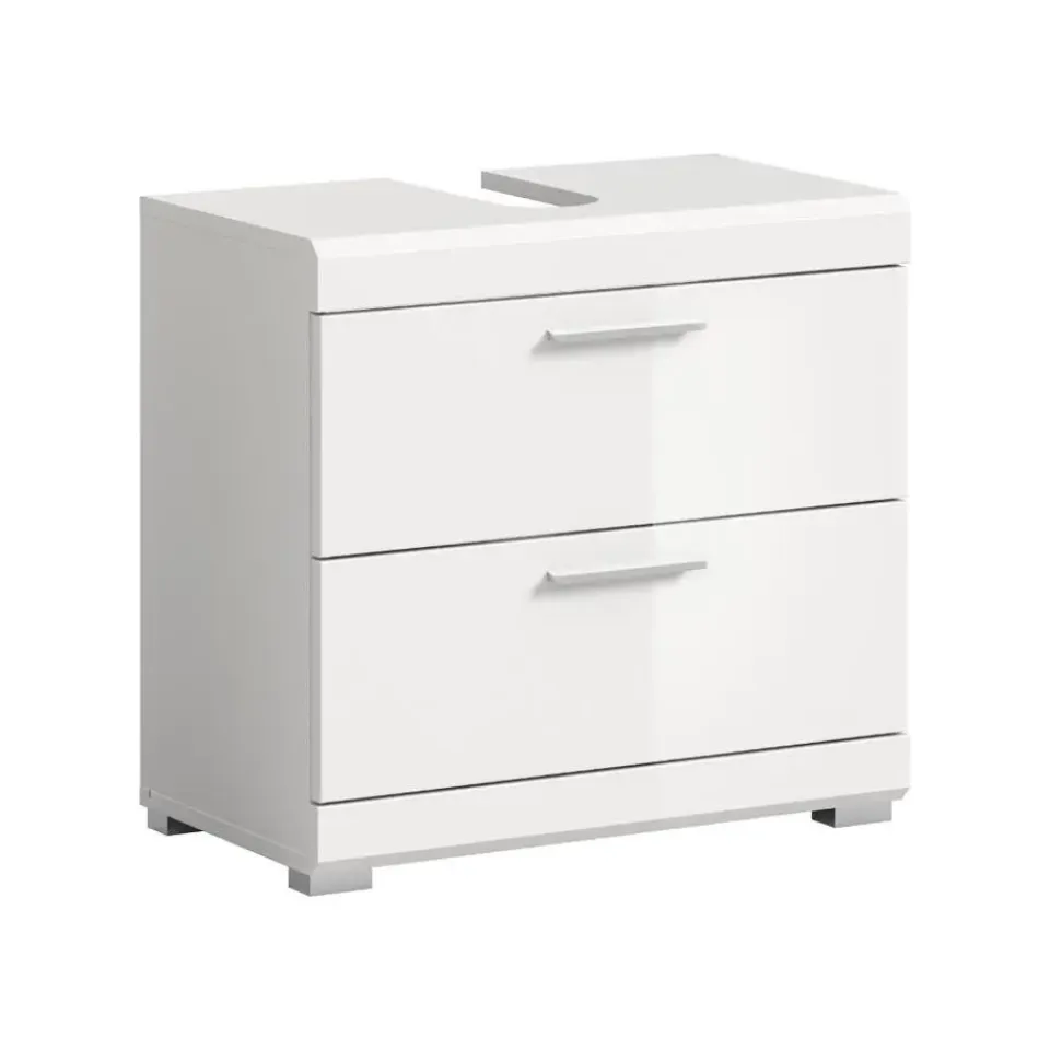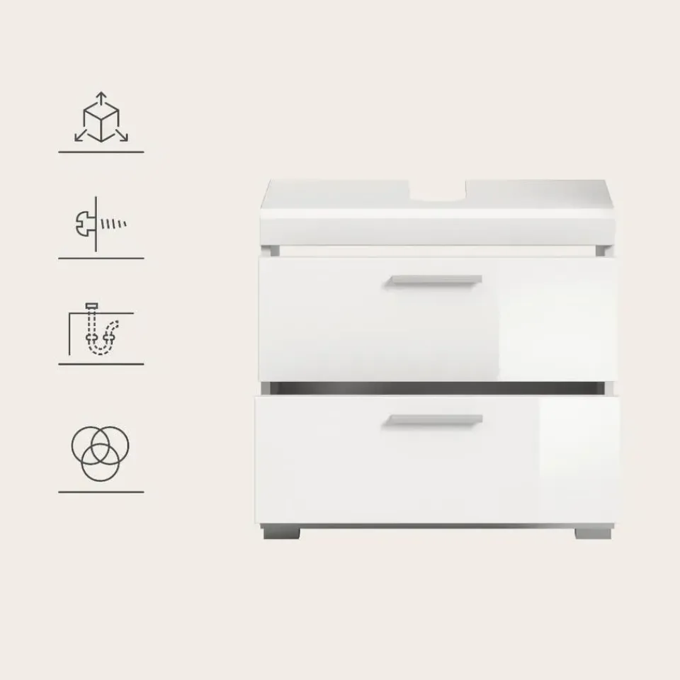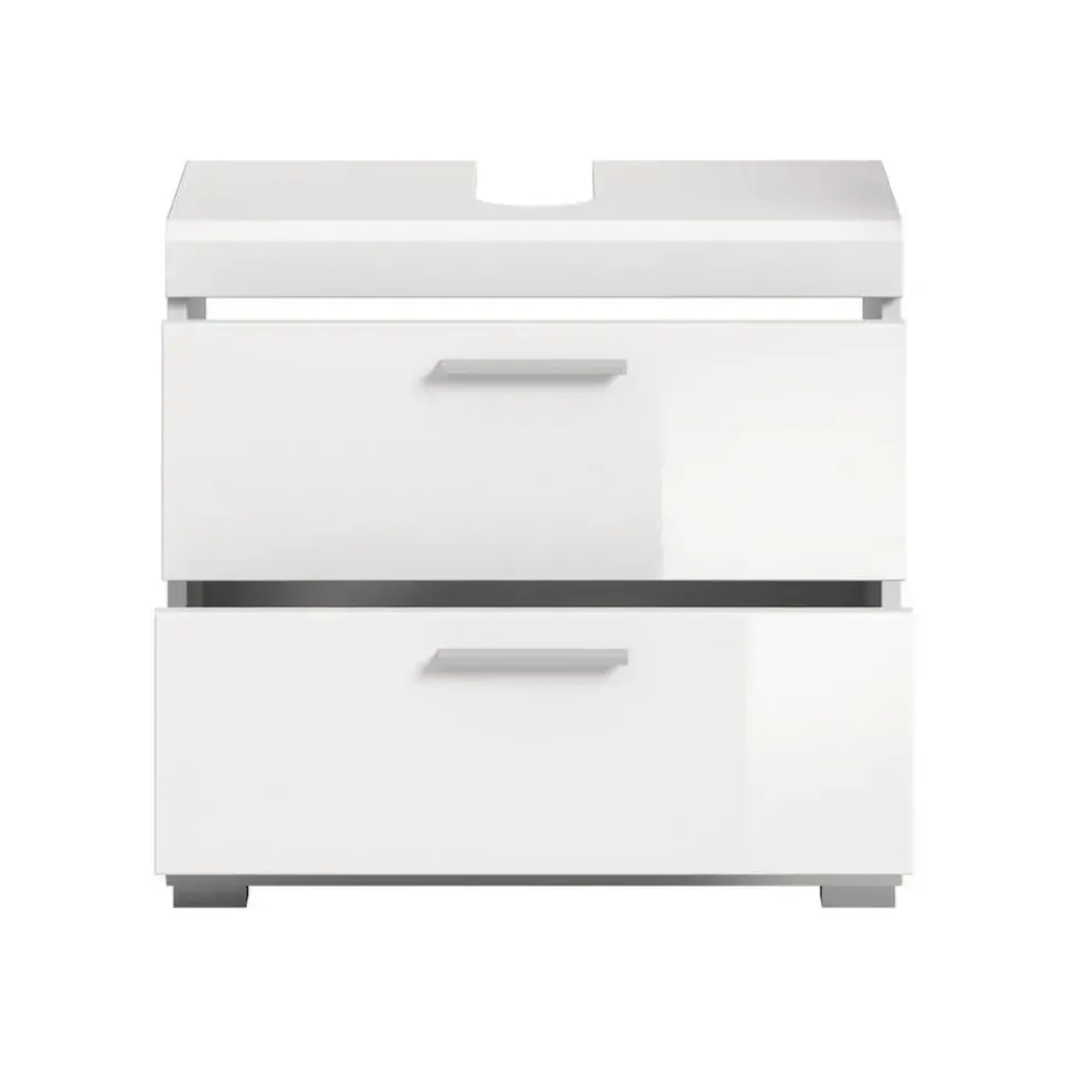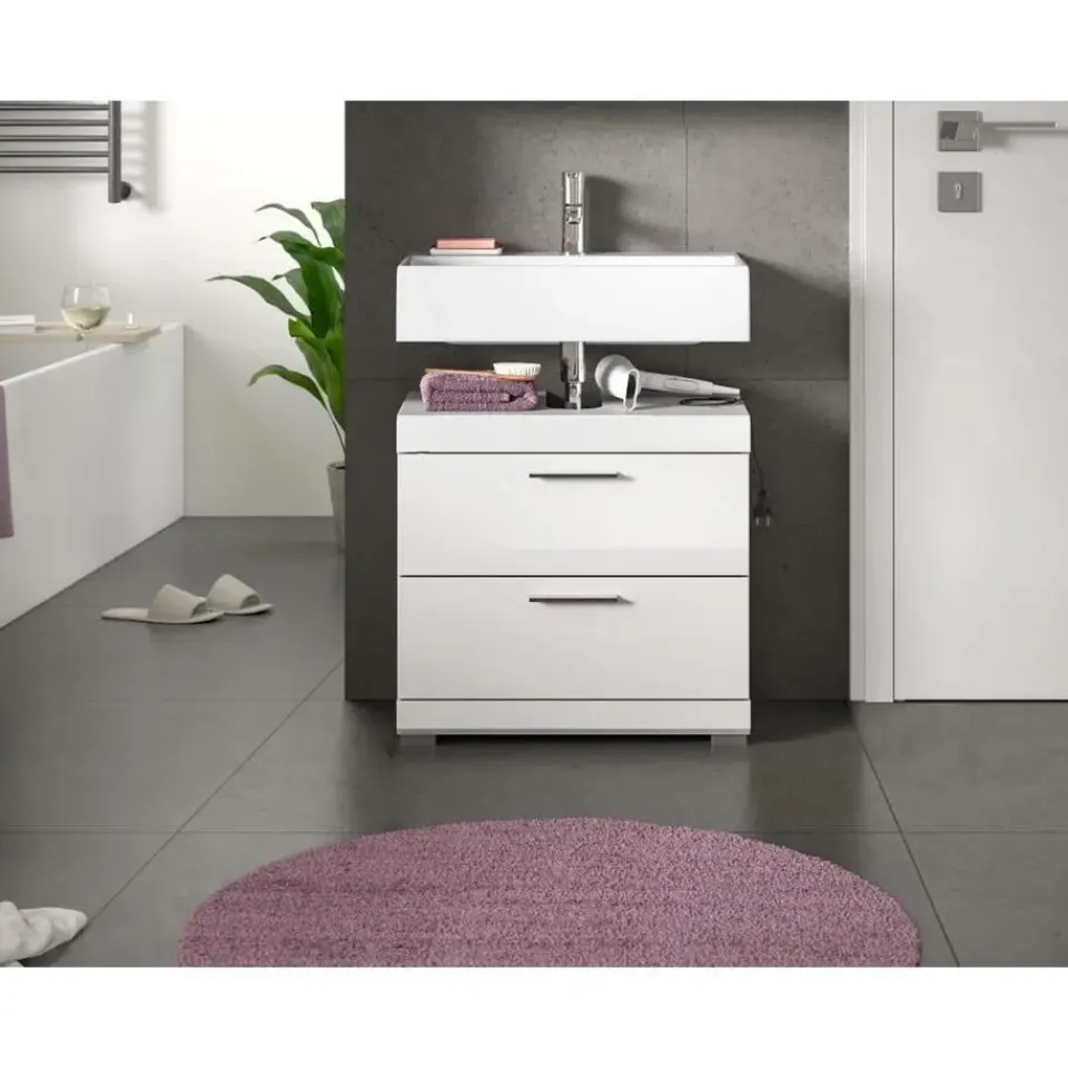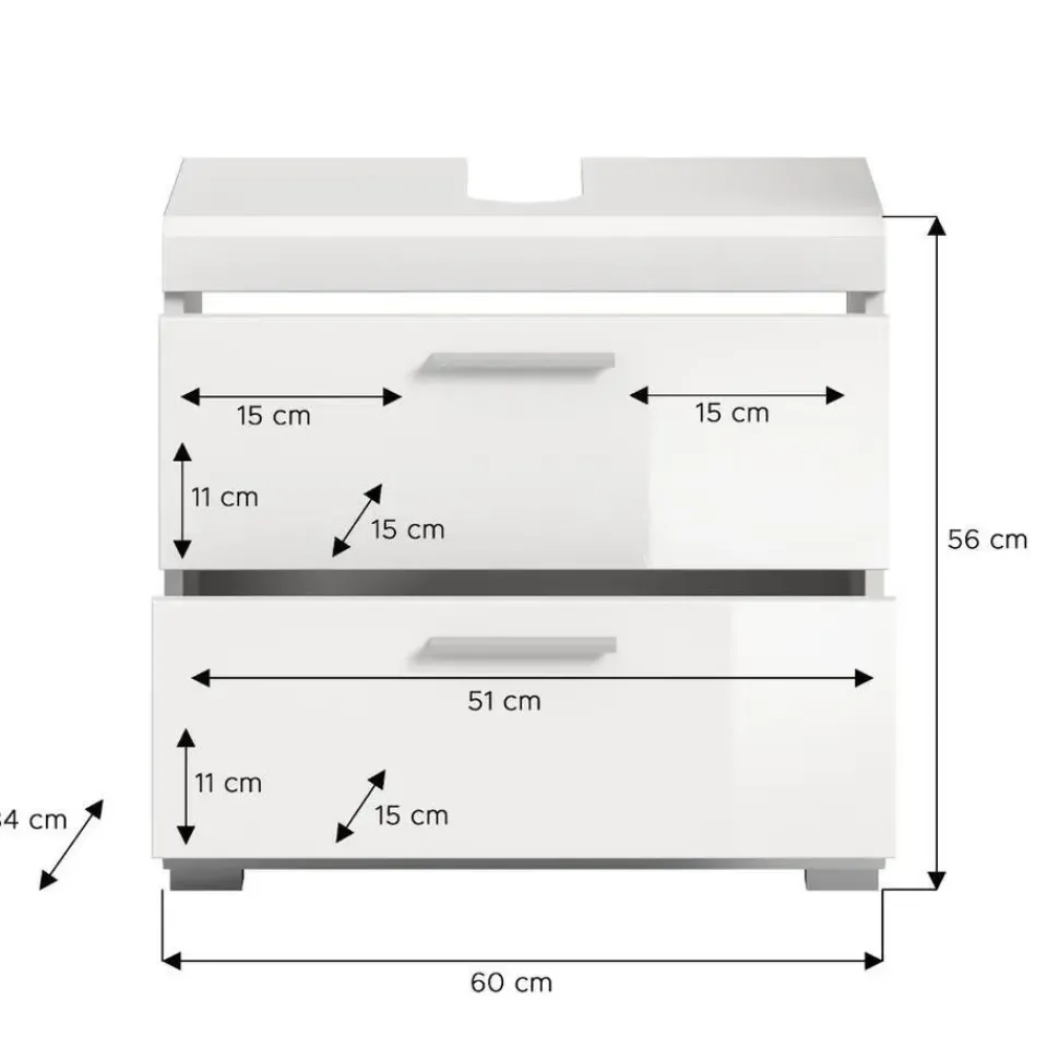 Scout wastafel 2 deuren, 2 lades, 2 planken wit hoogglans, wit. Zonder wastafel. Deur omkeerbaar. Lade volledig uitschuifbaar. In ons moderne assortiment presenteren we een badkamerkast in trendy wit met een hoogglanzend, diepgetrokken oppervlak dat uw badkamer een moderne uitstraling geeft. Met compacte afmetingen van 60 x 56 x 34 cm biedt hij niet alleen praktische opbergruimte, maar ook een stijlvol design. Ervaar de perfecte combinatie van functionaliteit en trendy elegantie met deze modieuze badkamerkast.