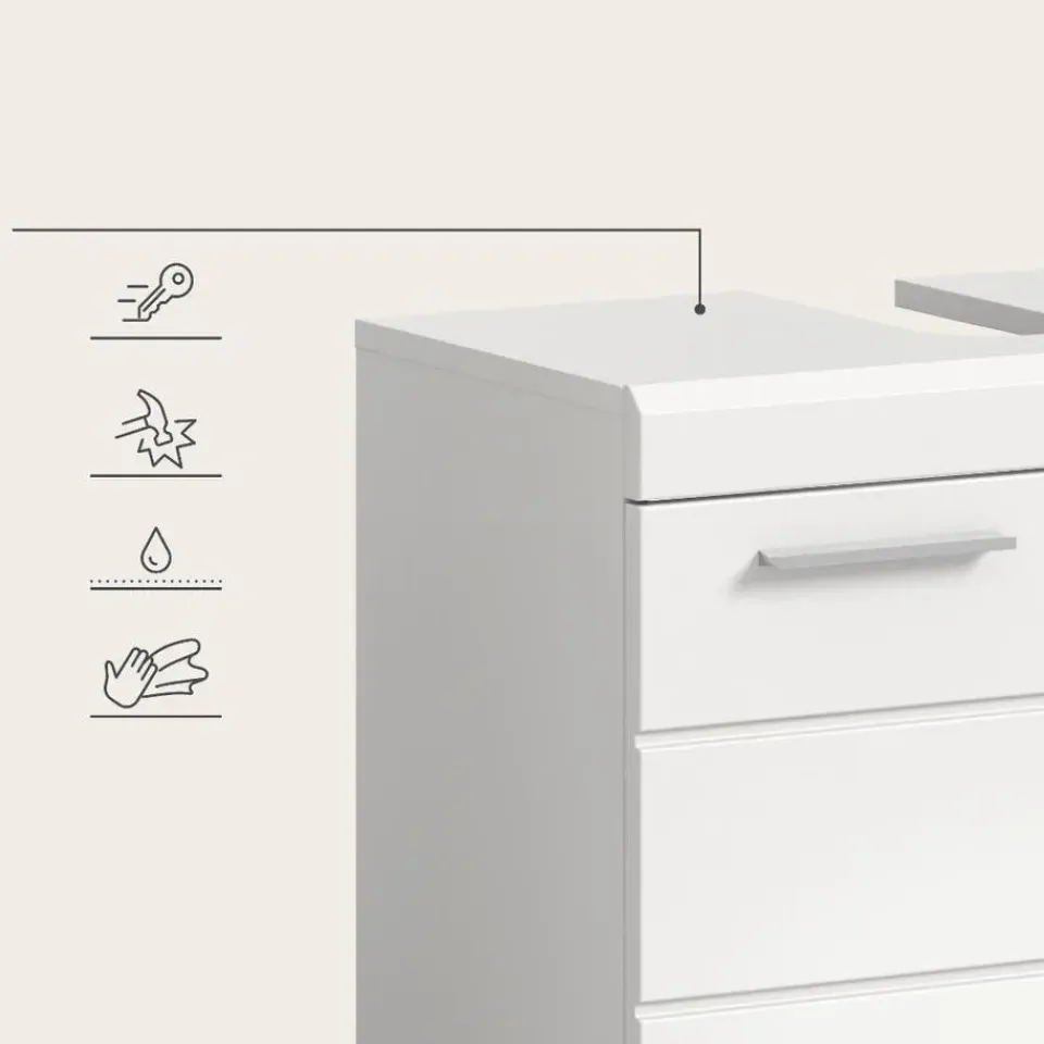 Scout wastafel 2 deuren, 2 lades wit hoogglans, wit. Zonder wastafel. Lade volledig uitschuifbaar. In ons moderne assortiment presenteren we een badkamerkast in trendy wit met een hoogglanzend, diepgetrokken oppervlak dat uw badkamer een moderne uitstraling geeft. Met compacte afmetingen van 60 x 56 x 34 cm biedt hij niet alleen praktische opbergruimte, maar ook een stijlvol design. Ervaar de perfecte combinatie van functionaliteit en trendy elegantie met deze modieuze badkamerkast.