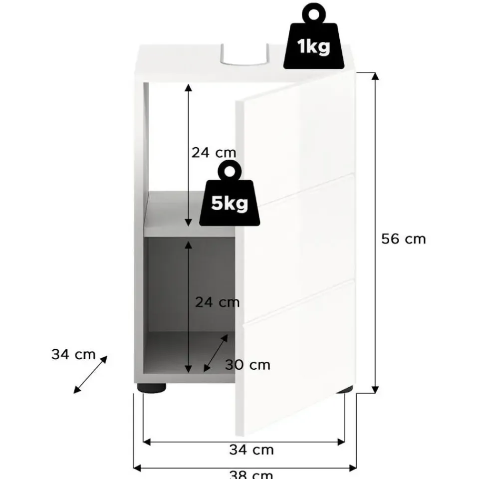 Vira wastafel 1 deur wit hoogglans, wit. Zonder wastafel. Deur omkeerbaar. Geef je badkamer een nieuwe look met ons stijlvolle witte melamine wastafelmeubel met een hoogglanzende, diepgetrokken afwerking. De compacte afmetingen passen perfect onder je wastafel en bieden tegelijkertijd voldoende opbergruimte voor al je badkamerbenodigdheden. Voeg een vleugje elegantie en functionele verfijning toe aan je badkamer met dit moderne meubel.