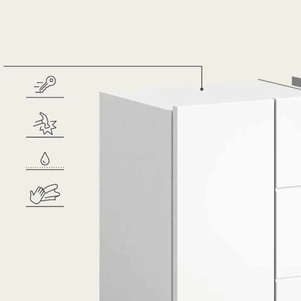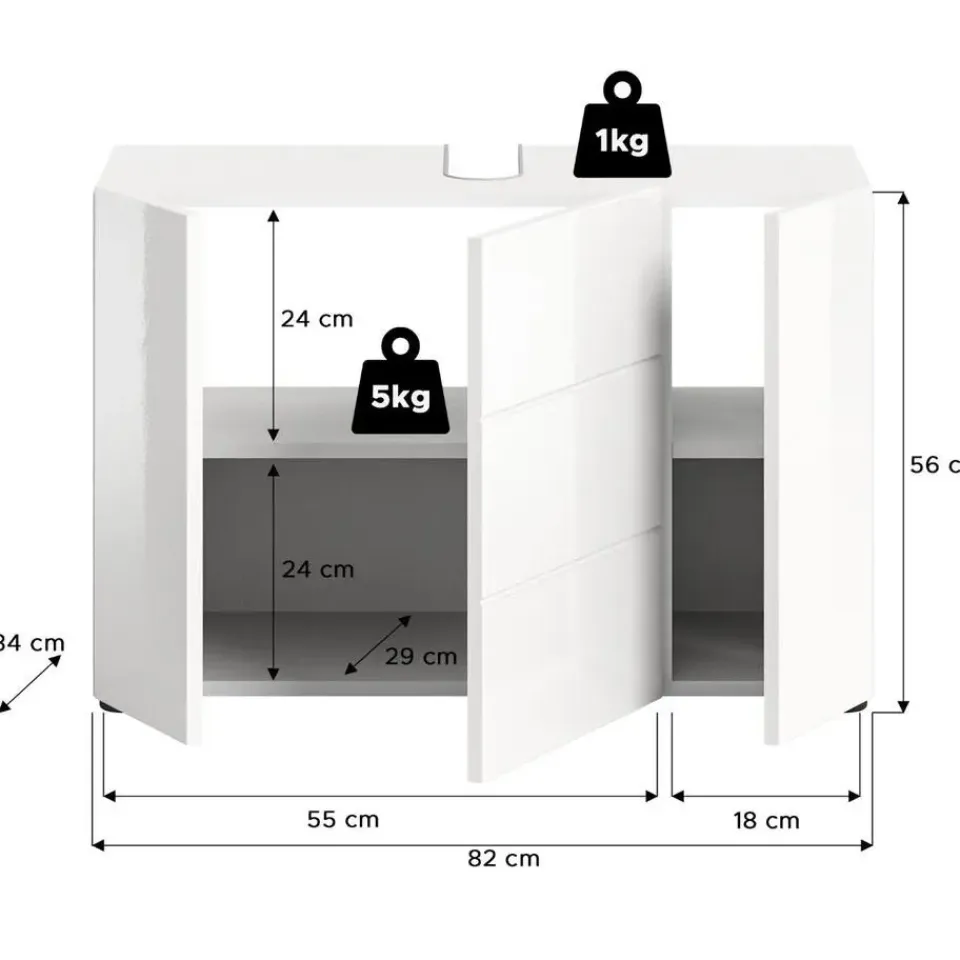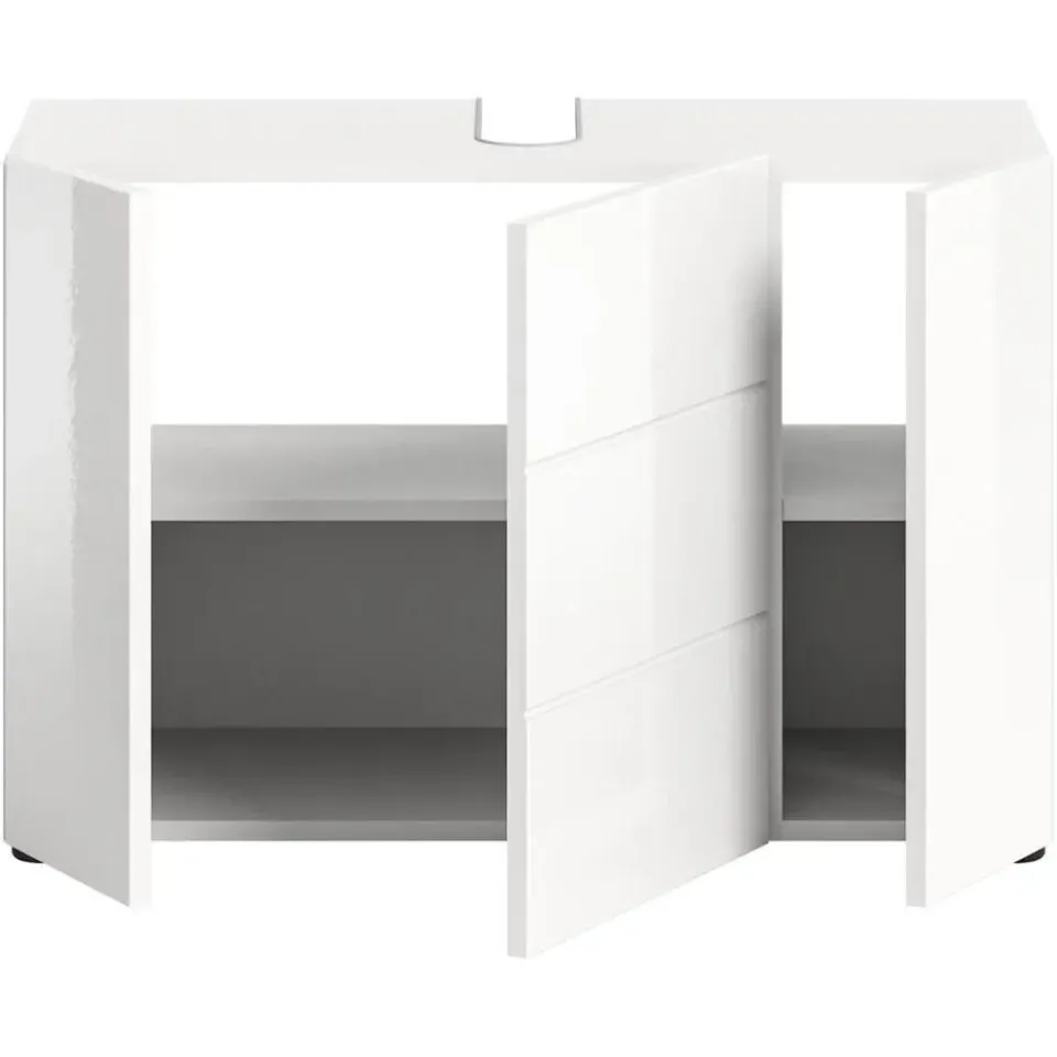 Vira wastafel 3 deuren, 5 lades wit hoogglans, wit. Zonder wastafel. Geef je badkamer een nieuwe look met ons stijlvolle witte melamine wastafelmeubel met een hoogglanzende, diepgetrokken afwerking. De compacte afmetingen passen perfect onder je wastafel en bieden tegelijkertijd voldoende opbergruimte voor al je badkamerbenodigdheden. Voeg een vleugje elegantie en functionele verfijning toe aan je badkamer met dit moderne meubel.