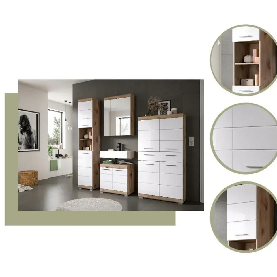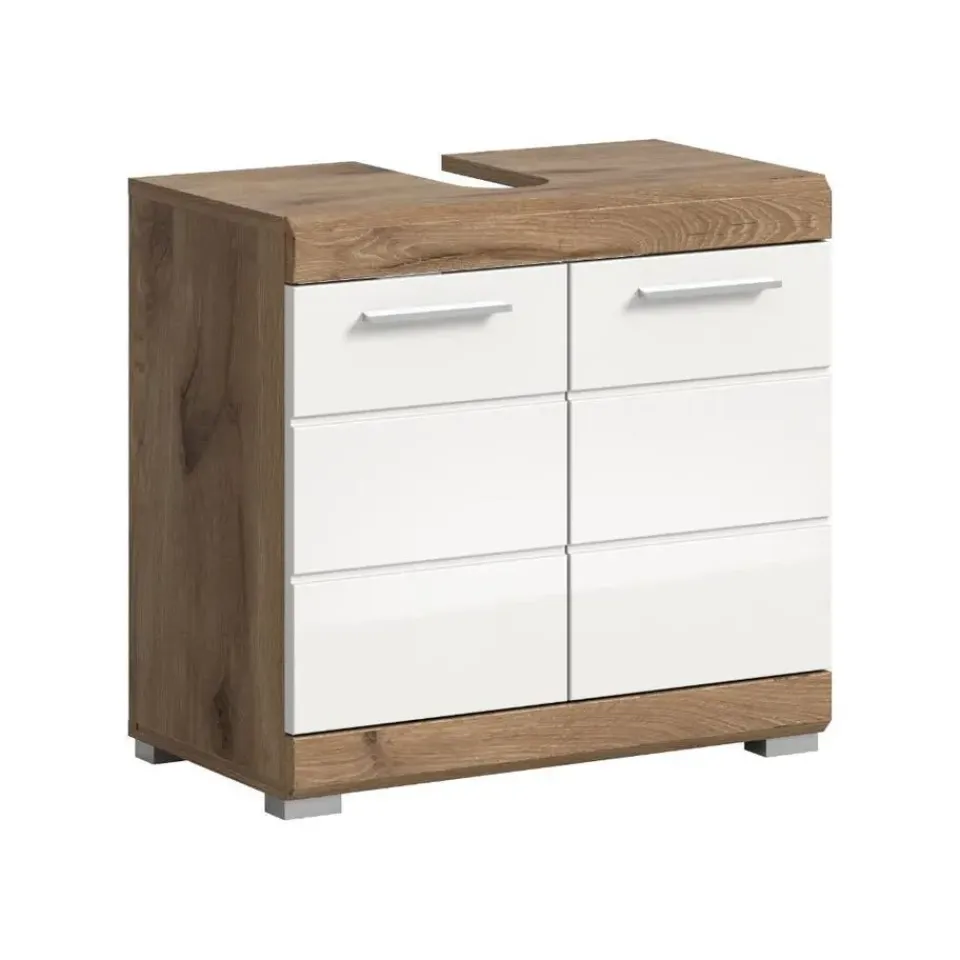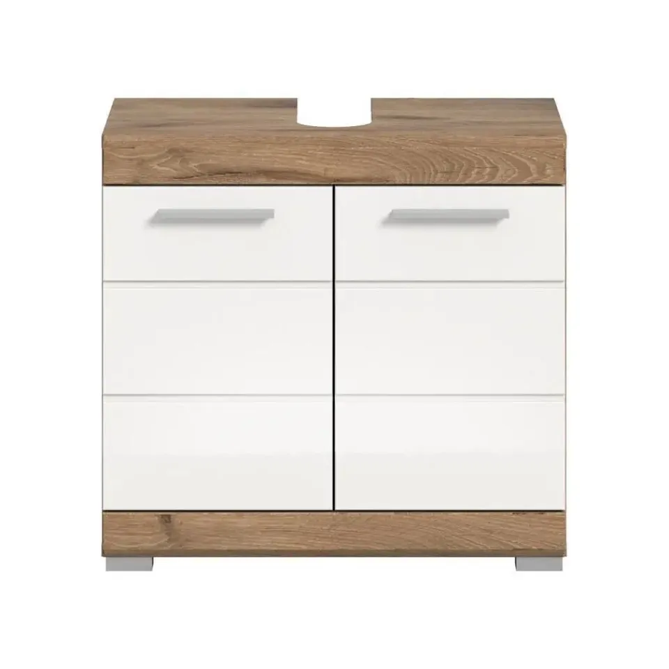 Wave wastafel 2 deuren wit hoogglans, eiken decor. Zonder wastafel. Deur omkeerbaar. Geef uw badkamer een nieuwe look met een elegant en functioneel wastafelmeubel. Met een afmeting van 37 x 191 x 31 cm biedt dit meubel een stijlvolle opbergoplossing voor uw badkamerartikelen. Het hoogglans witte front geeft het meubel een moderne en verfijnde uitstraling. In combinatie met de details van Nox Oak creëert het een harmonieus design dat perfect past in elk badkamerinterieur. Achter de twee deuren bevinden zich twee ruime vakken die voldoende ruimte bieden voor handdoeken, schoonmaakproducten en andere badkamerartikelen. Gemaakt van FSC®-gecertificeerd houtmateriaal, symboliseert dit meubel duurzaamheid en milieubescherming. Het combineert hoogwaardig vakmanschap met een bijdrage aan het behoud van onze bossen. Transformeer uw badkamer tot een oase van rust en stijl met dit tijdloze wastafelmeubel dat functionaliteit en esthetiek perfect combineert!