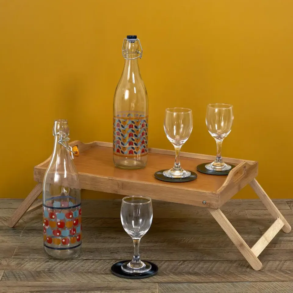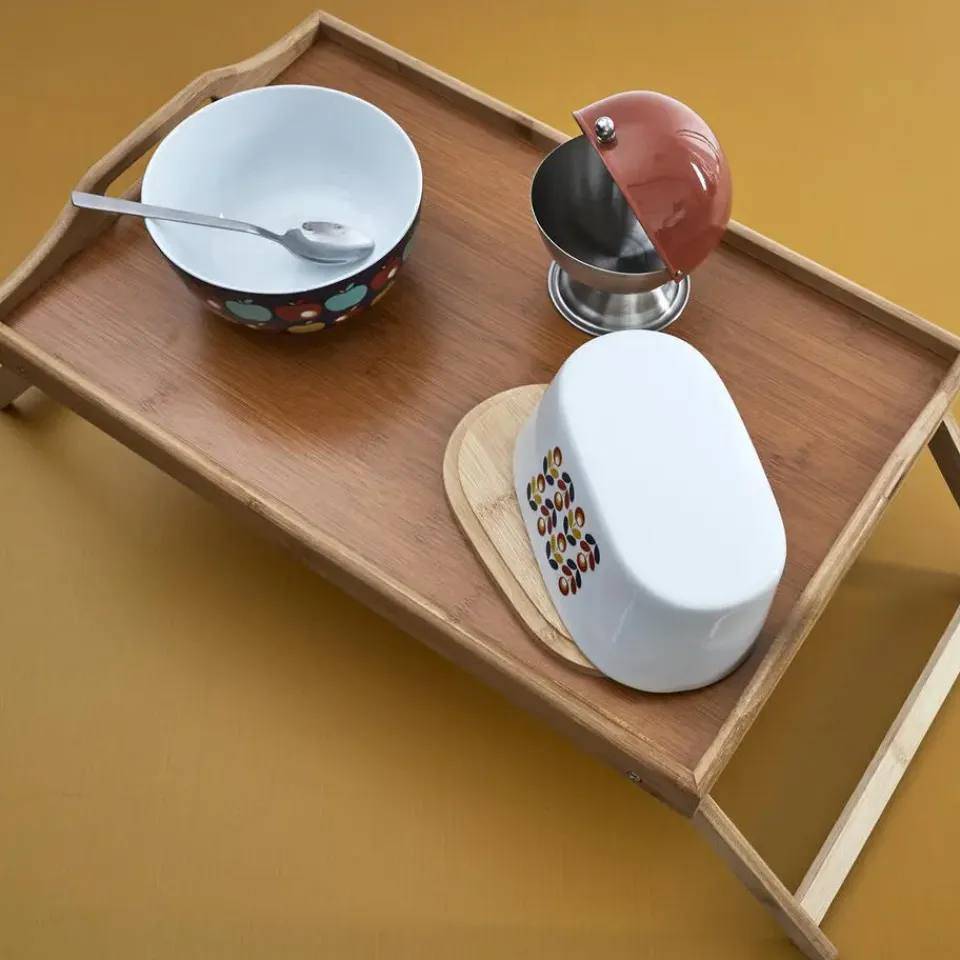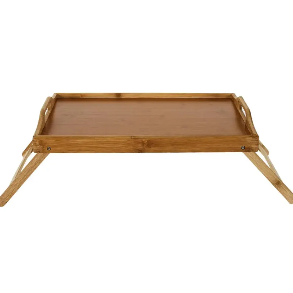 Ontbijt op bed / laptop of lees tafeltje / dienblad op pootjes, gemaakt van bamboe hout. Dit serveertafeltje beschikt over inklapbare pootjes waardoor deze ideaal is voor het serveren van een ontbijtje op bed, maar ook om bijvoorbeeld een filmpje te kijken op de tablet/laptop of om een boek te lezen. Makkelijk schoon te maken met een vochtige doek. Afmeting met uitgeklapte pootjes: 45 x 30 x 17 cm. Materiaal: bamboe. Handig bedtafeltje.