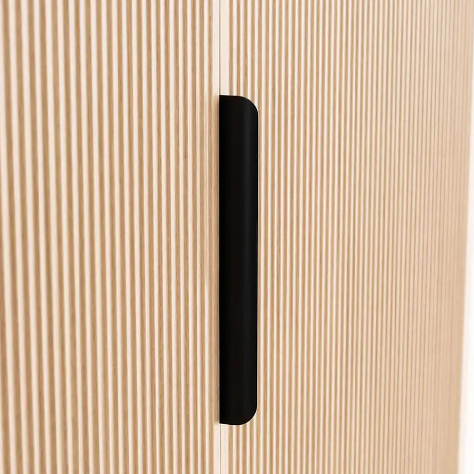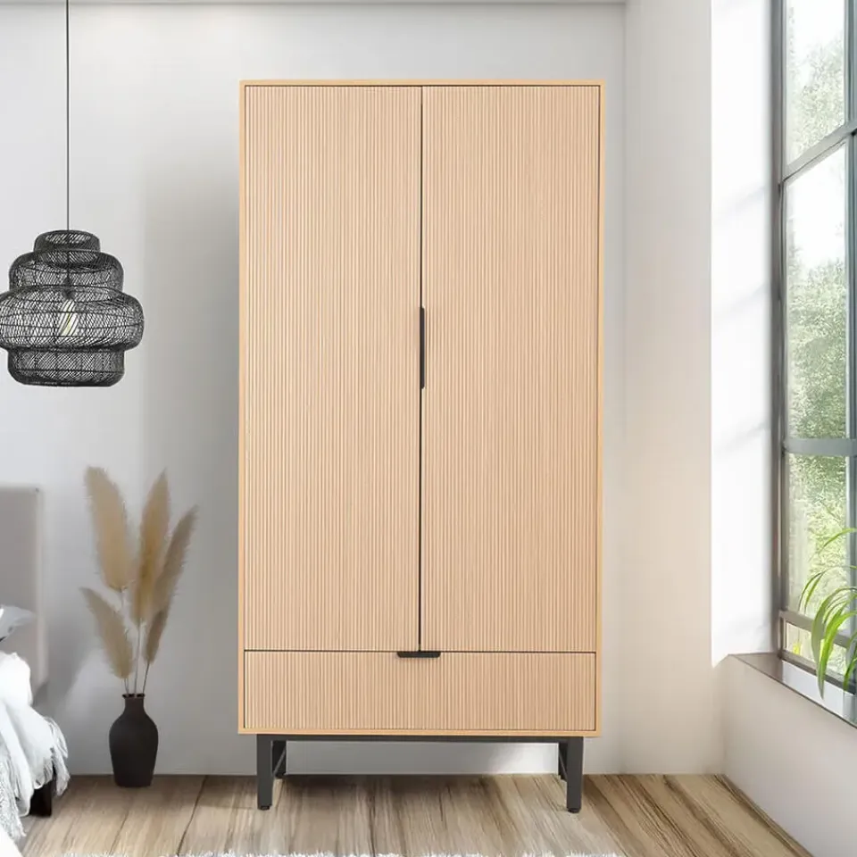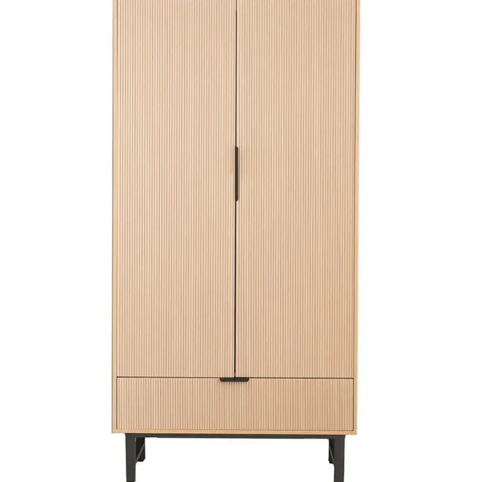 De NYLA kledingkast combineert stijlvol design met praktische functionaliteit. De geribbelde fronten plaatsen moderne accenten en geven elke kamer een elegante touch. Dankzij de stevige metalen poten heeft de kast een hoogwaardige uitstraling en staat hij stabiel. Met zijn doordachte indeling biedt NYLA royale opbergruimte voor kleding, accessoires en meer. De geïntegreerde kledingroede zorgt voor georganiseerde opslag, terwijl het onderhoudsvriendelijke oppervlak het dagelijks leven makkelijker maakt. Hoogwaardige materialen garanderen duurzaamheid en stabiliteit. De eenvoudige montage maakt een snelle installatie mogelijk – voor een kledingkast die niet alleen praktisch is, maar ook een echte blikvanger. Perfect voor elk modern huis!