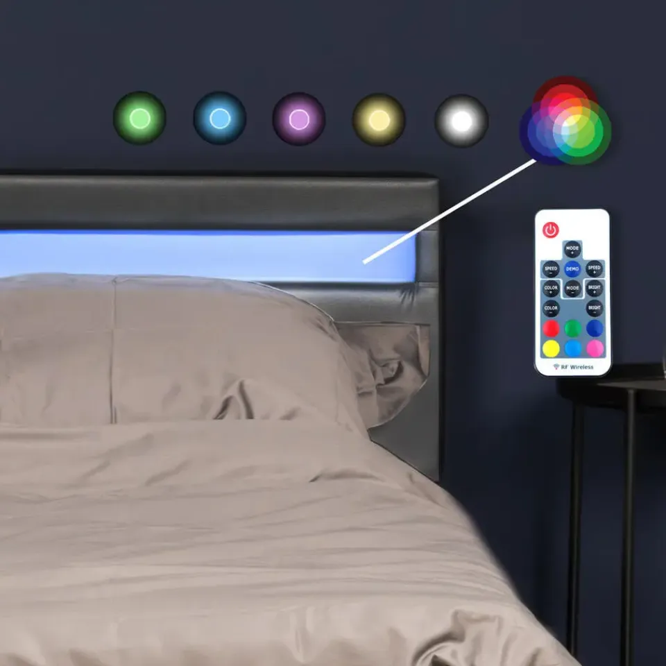 De lattenbodems zijn stevig en de lattenafstand past op alle standaard matrassen. Dit garandeert je optimaal ligcomfort en de best mogelijke ventilatie. De in het hoofdbord geïntegreerde LED-lichtlijst kan met een afstandsbediening worden aangepast aan je kleurvoorkeuren, kleurveranderingen, helderheidsniveaus en persoonlijke voorkeuren. Creëer de sfeer in de kamer naar jouw smaak. De bekleding van het hoofd-, zij- en voeteneind is gemaakt van slijtvast en onderhoudsvriendelijk kunstleer.