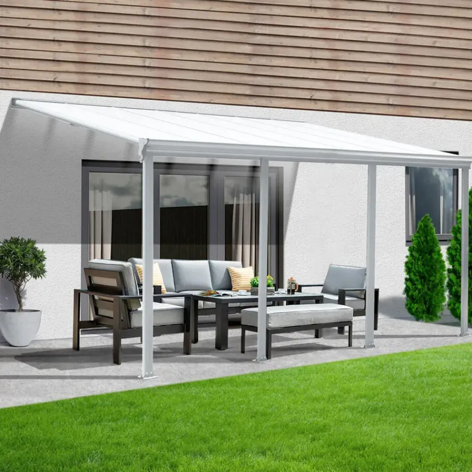 * In tegenstelling tot sommige houten overkappingen zijn onze terrasoverkappingen van gegalvaniseerd staal, aluminium met poedercoating en polycarbonaatplaten met UV-bescherming duurzaam en resistent.