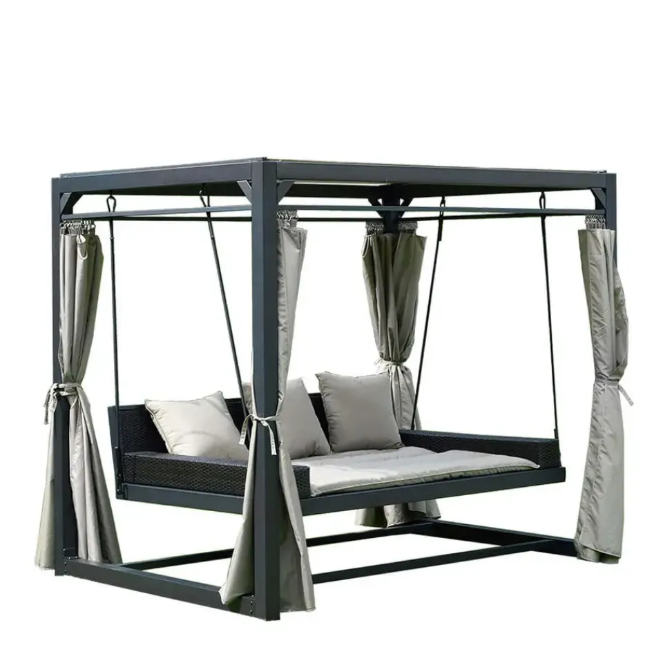 Het model heeft een robuust frame van gepoedercoat staal. In totaal dienen vier stevige ijzeren staven als houders voor de heerlijk brede en diepe bank. Arm- en rugleuning zijn gemaakt van robuust polyrotan. Zonwering of ligstoel: een licht vouwdak dat open of dicht kan, biedt u beide mogelijkheden. Hoogtepunten zijn de zachte kussens en de heerlijk mooie gordijnen, die ook bij het tuinpaviljoen worden meegeleverd.