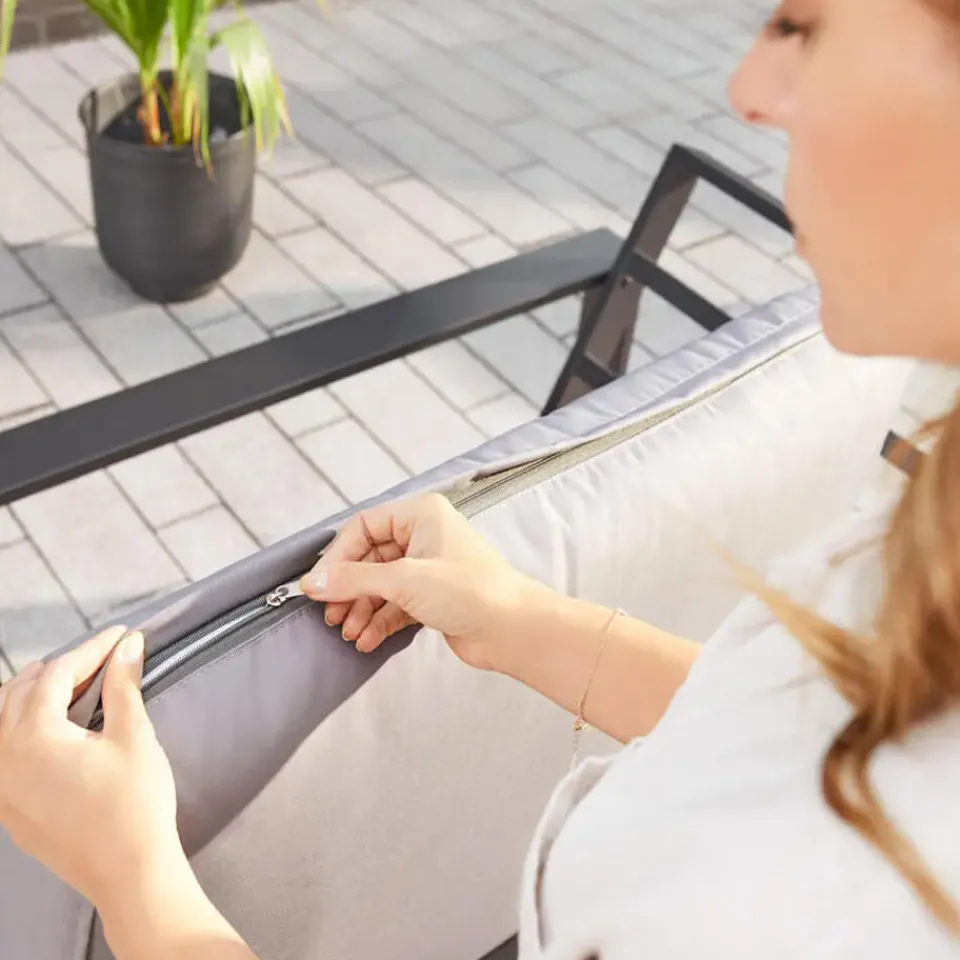 Comfortabel in de tuin – de RIO zithoek RIO biedt je een stijlvolle manier om de dag af te sluiten. In plaats van na een lange dag in de benauwde woonkamer te zitten, kun je buiten op deze comfortabele zithoek genieten van de laatste zonnestralen. Hij is gemaakt van hoogwaardig aluminium en combineert tijdloze schoonheid met functionaliteit. De brede rug- en armleuningen en de waterafstotende kussens zorgen voor maximaal comfort. Dankzij het weerbestendige, vuilafstotende en UV-bestendige materiaal is de set ideaal voor in de tuin, patio, serre of tuinhuisje. De lichtgewicht aluminium constructie maakt hem makkelijk verplaatsbaar en garandeert duurzaamheid zonder te roesten. Perfect om te ontspannen met familie en vrienden.