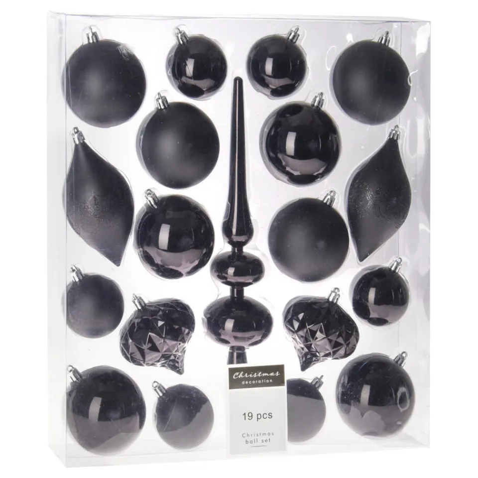 Set 19-delig kunststof kerstballen/ornamenten met piek zwart. Set van onbreekbare kerstballen/ornamenten met een piek/kerstboom topper. Maten kerstballen en ornamenten: 6 cm, 8 cm en 13 cm. Hoogte piek: 30 cm. Onze kerstballen worden standaard geleverd met ophanglintjes maar wij adviseren u om kerstbalhaakjes mee te bestellen.