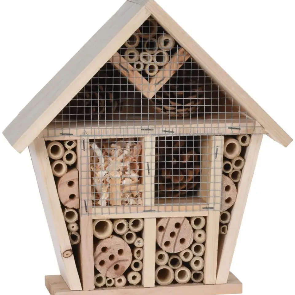 Een insecten hotel voor bijen, vlinders, lieveheersbeestjes, kevers, duizendpoten en andere insecten. In dit insectenhotel kunnen de dieren uitrusten/overwinteren. Afmeting: ca. 30 x 25 x 11 cm. Materiaal: sparrenhout en draad. Met ophangsysteem. Dit diervriendelijke tuindecoratie accessoires bijenhuis/vlinderhuis insectenhotel draagt bij aan het ecosysteem en de biodiversiteit in de tuin. Een habitat voor bestuivers en natuurlijke ongediertebestrijders. Een must-have voor tuinliefhebbers/natuurliefhebbers.