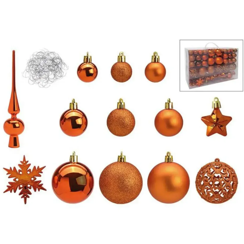Breng een warme, koperkleurige glans aan je kerstboom met deze uitgebreide set van 110 kerstversieringen. De set bevat kerstballen en ornamenten in diverse maten van 3 cm tot 6 cm, plus een bijpassende piek voor een feestelijke afwerking.