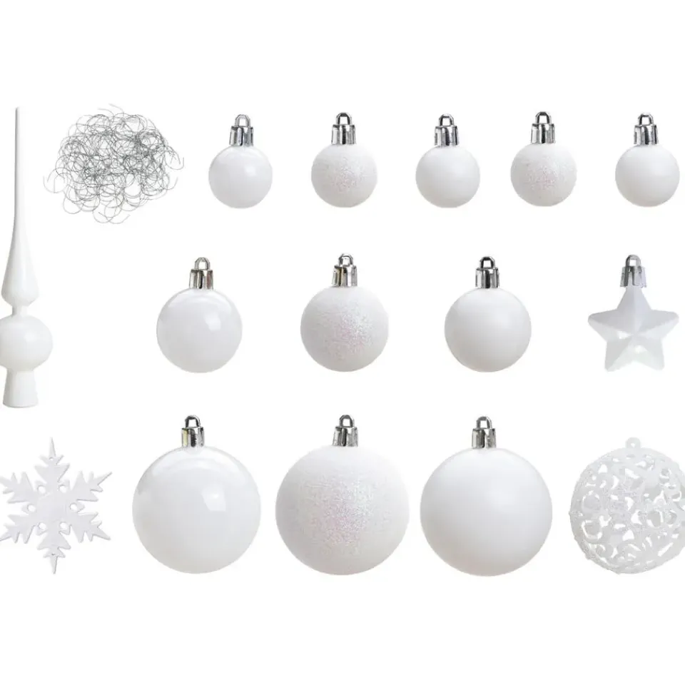 Pakket met 110x stuks kunststof kerstballen/kerstornamenten met piek wit. De set bestaat uit diverse maten kerstballen en ornamenten van 3 t/m 6 cm.