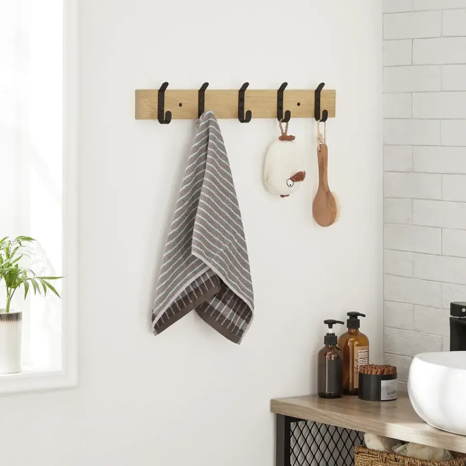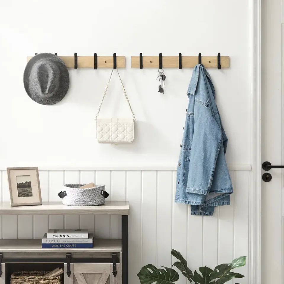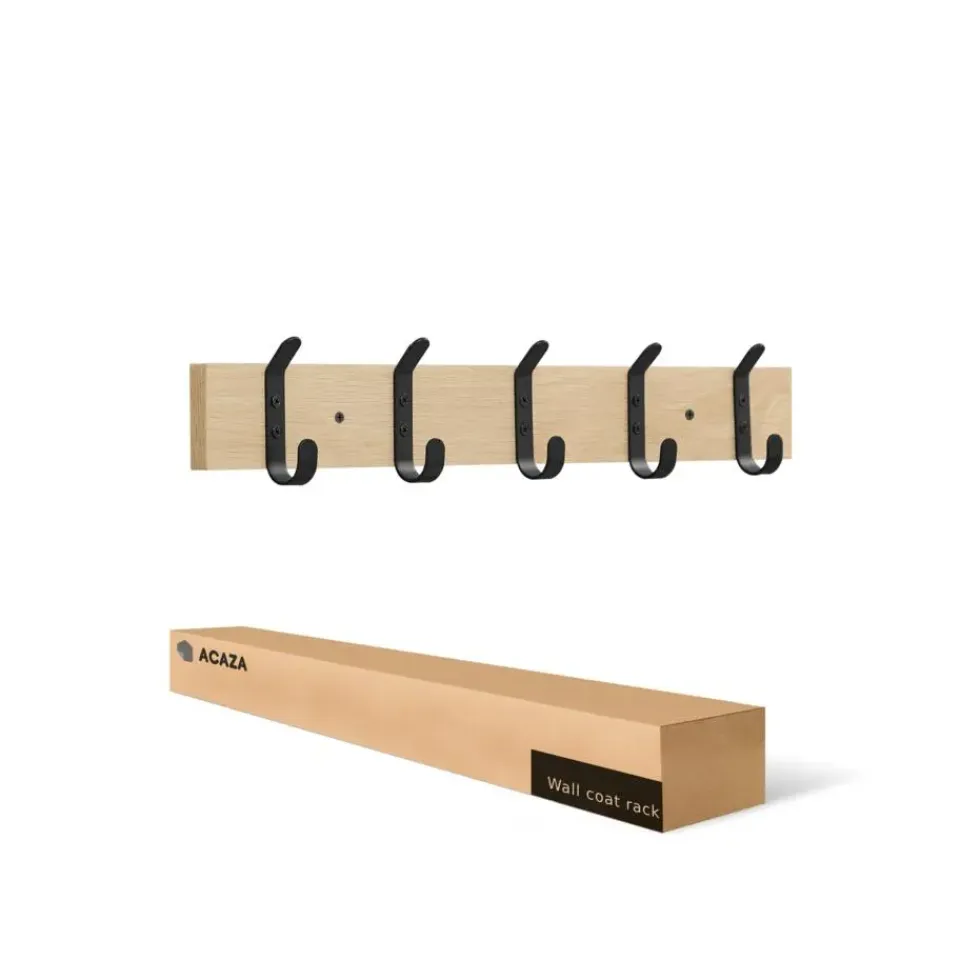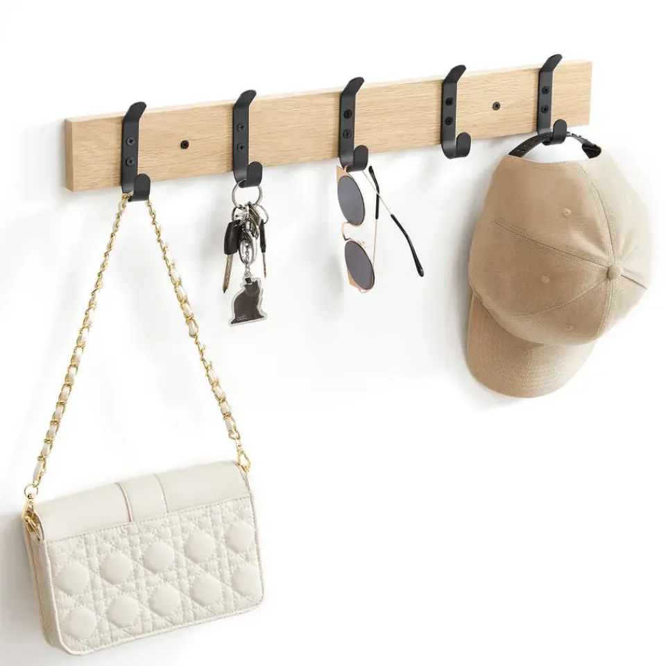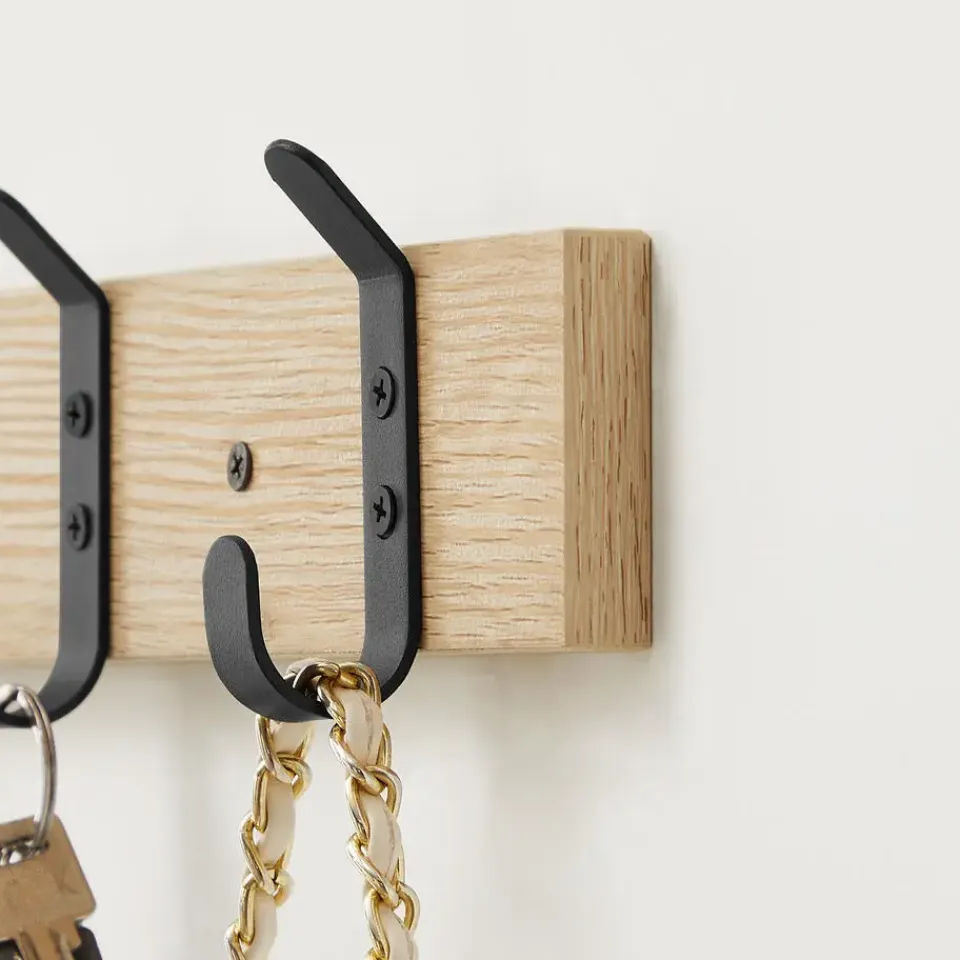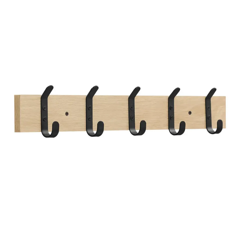 Dankzij de lichte eikenkleur en de mat zwarte haken heeft deze lange kapstok een strakke, maar warme look. De haken zijn slim geplaatst zodat je 2 van deze kapstokken naast elkaar kan monteren.