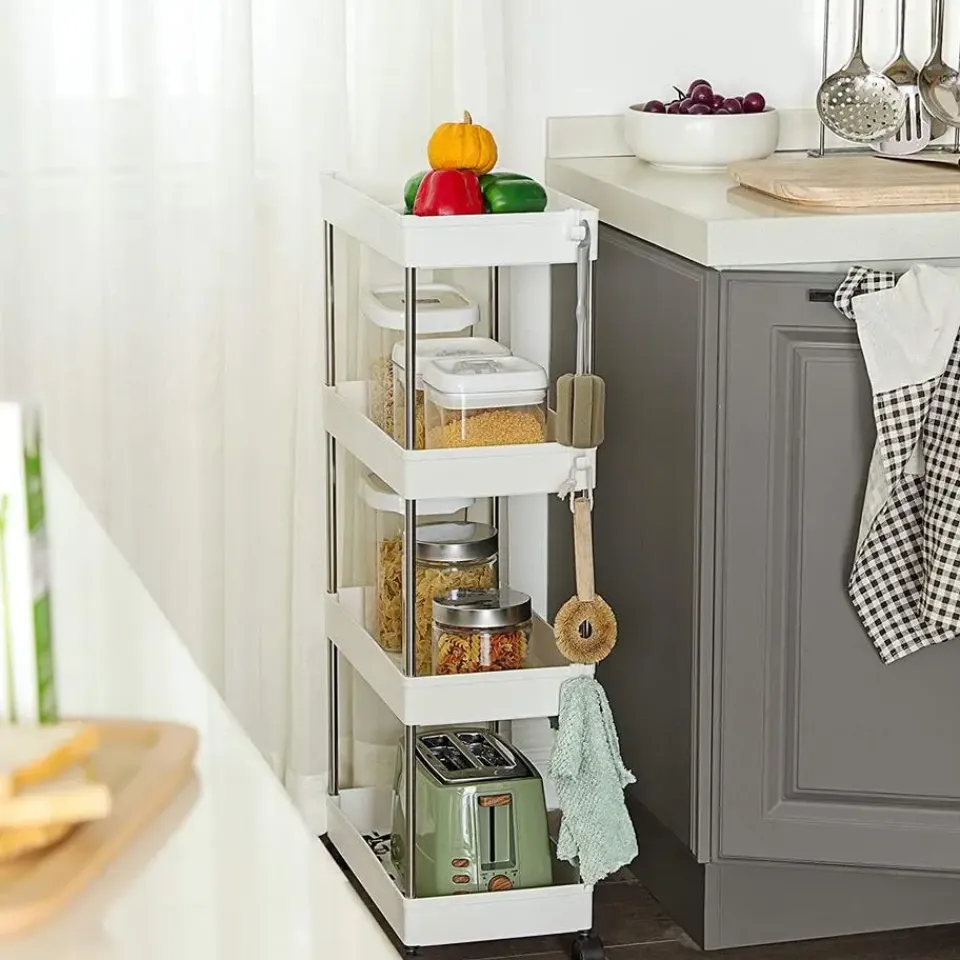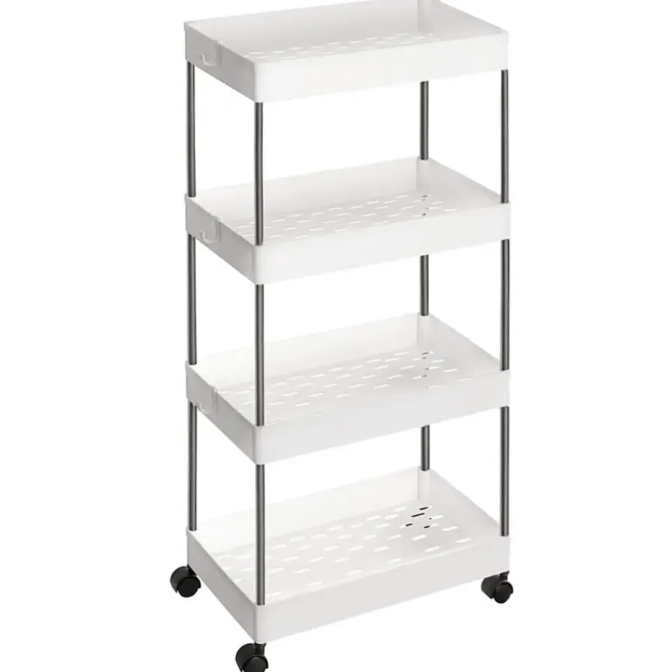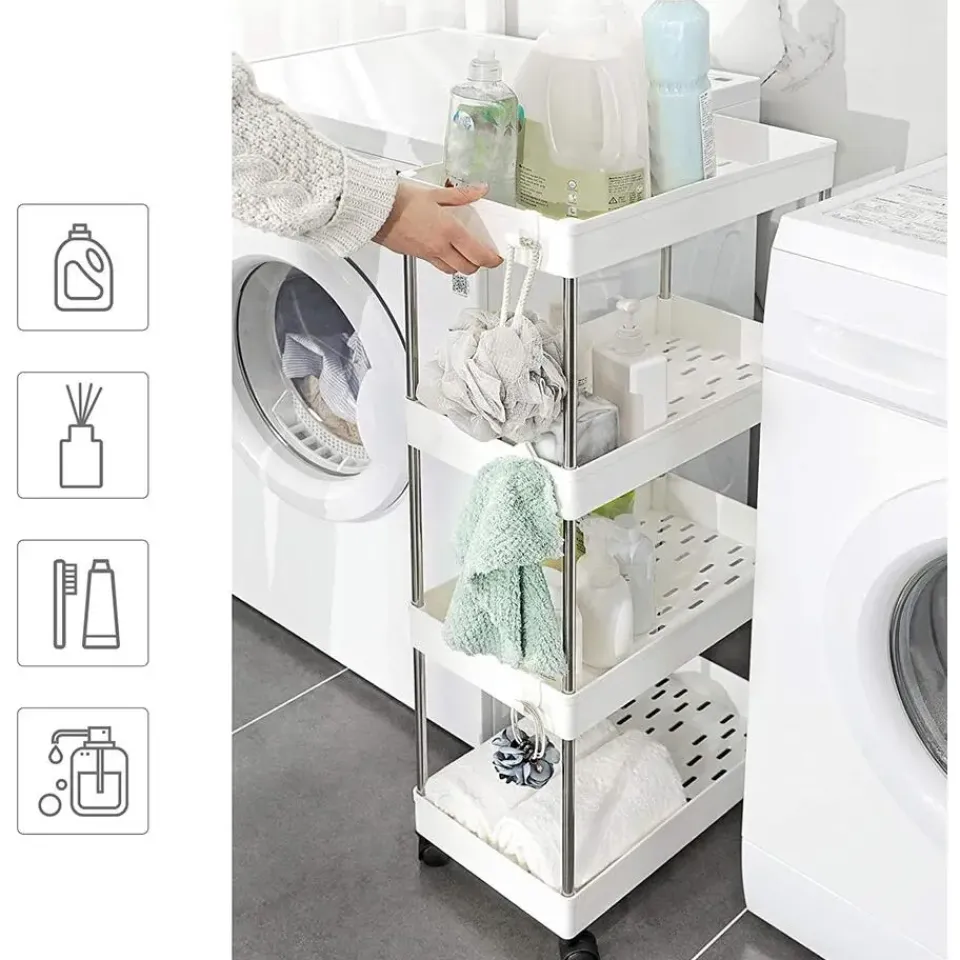 Op zoek naar een multifunctioneel rekje voor in jouw badkamer, keuken of kantoorruimte? Dan is deze trolley perfect voor jou! Dankzij de 4 universele wielen met soepel glijdende ijzeren staven, verplaats je de trolley super gemakkelijk. De legplankjes zijn gemaakt van stevige en duurzame ijzeren buizen, met waterbestendige, hoogwaardige PP-planken. Elk plankje kan tot 5 kg dragen. Handig weetje! De trolley bevat 3 extra haken, perfect voor handdoeken of pannelappen.