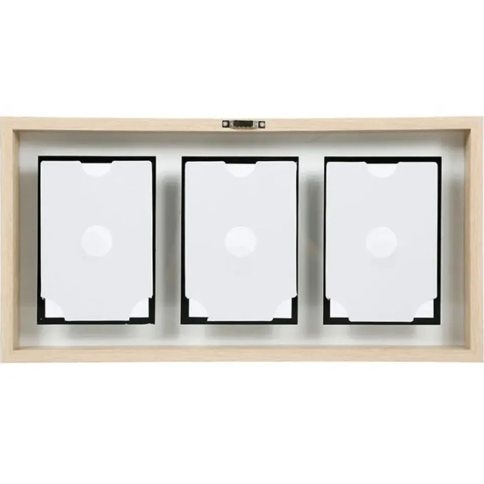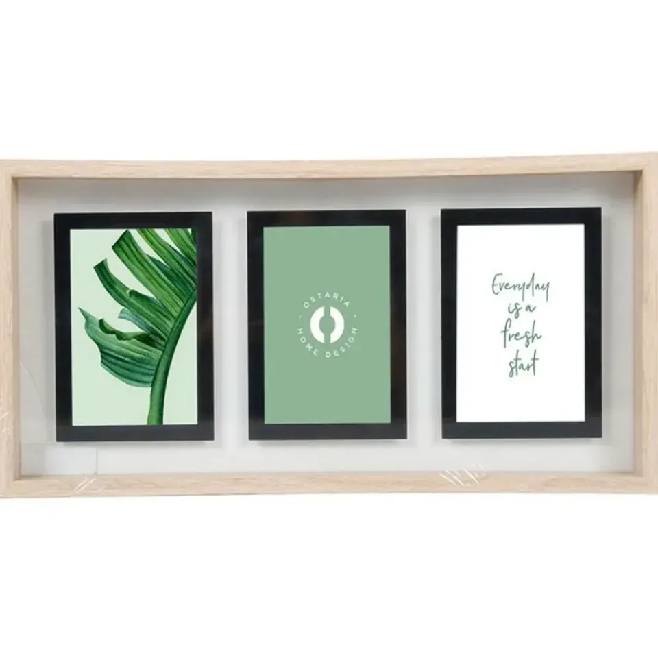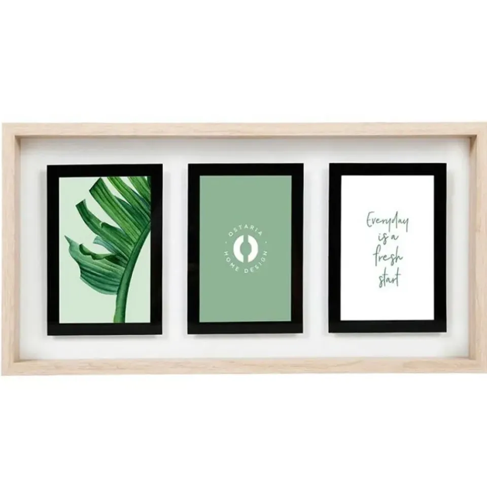 Collage fotolijst uit de NEO serie voor meerdere foto’s. Stel je foto’s tentoon met deze collage fotolijst in de kleur naturel hout met passe partout randen in de kleur zwart. Deze moderne foto collage bestaat uit 3x fotolijstjes voor foto’s met afmetingen van 10 x 15 cm. Materiaal: hout/glas. Merk: Ostaria. Voorzien van ophangingen op deze op te hangen. Formaat: 47 x 23 cm. Wissellijst.