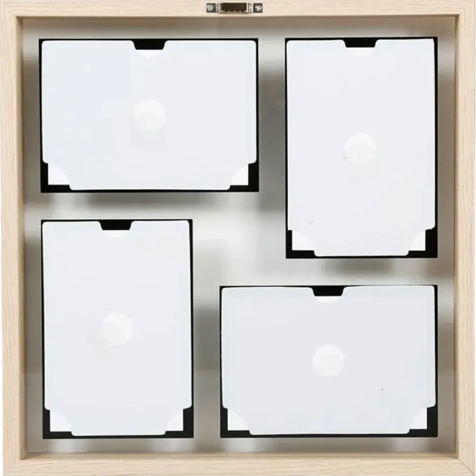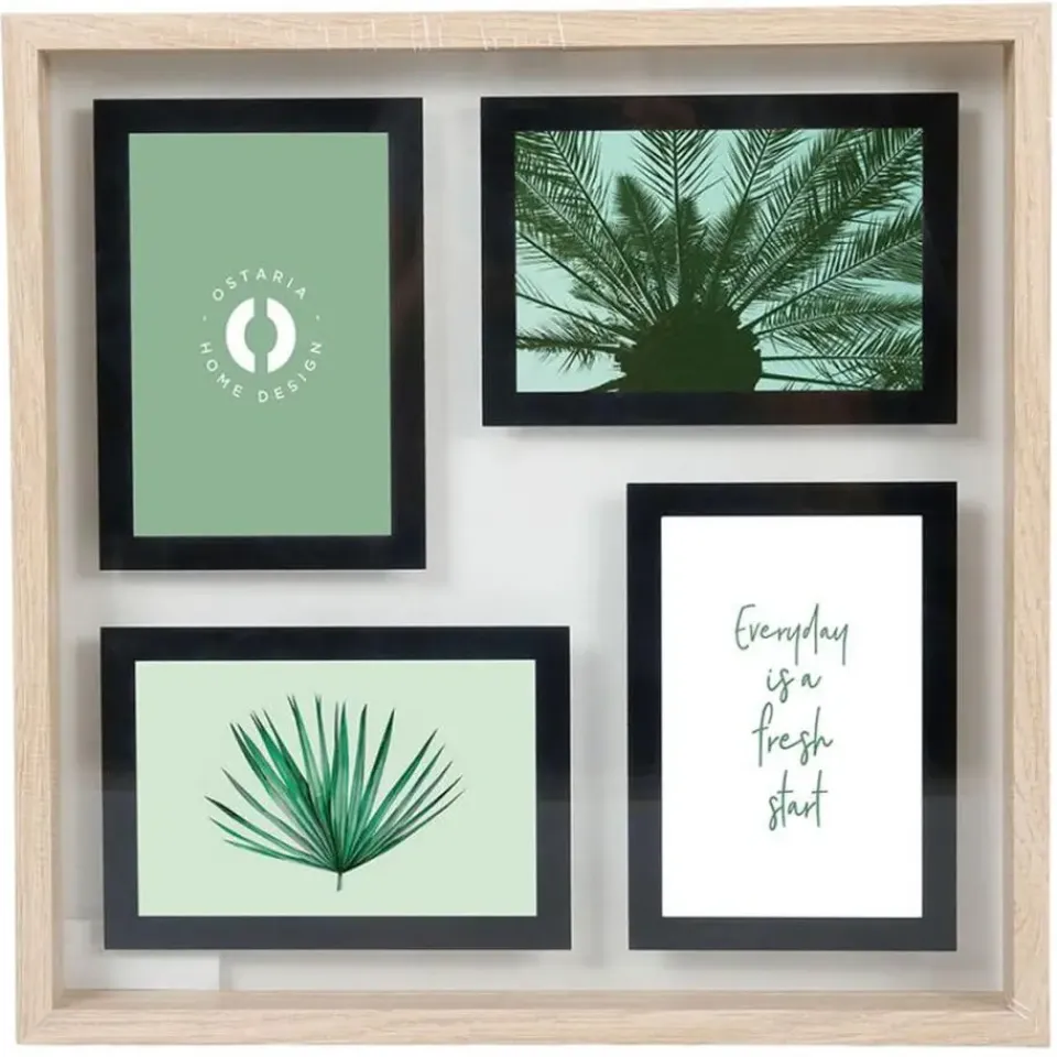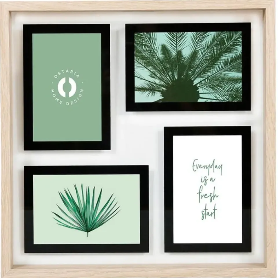 Collage fotolijst uit de NEO serie voor meerdere foto’s. Stel je foto’s tentoon met deze collage fotolijst in de kleur naturel hout met passe partout randen in de kleur zwart. Deze moderne foto collage bestaat uit 4x fotolijstjes voor foto’s met afmetingen van 10 x 15 cm. Materiaal: hout/glas. Merk: Ostaria. Voorzien van ophangingen op deze op te hangen. Formaat: 36 x 36 cm. Wissellijst.