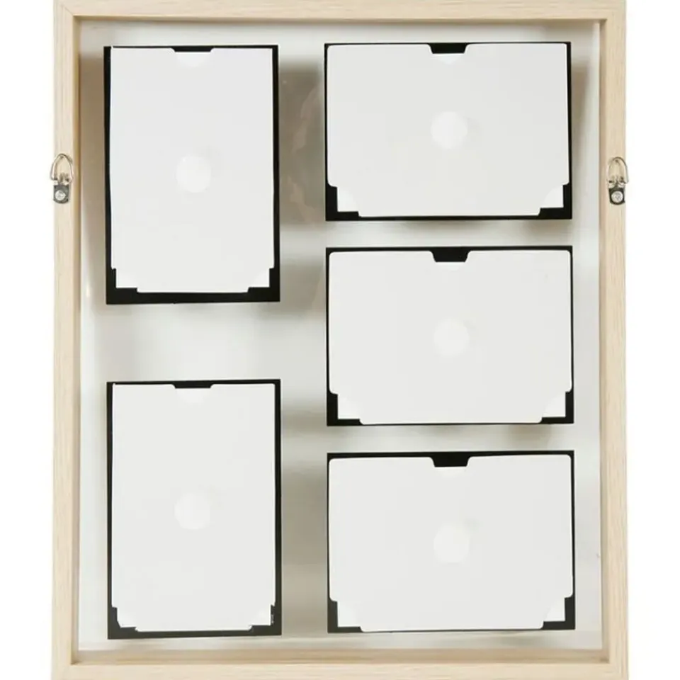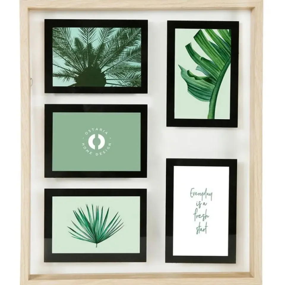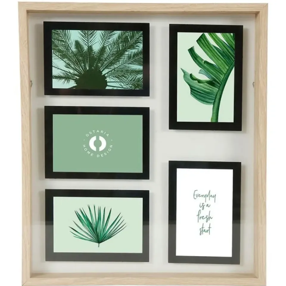 Collage fotolijst uit de NEO serie voor meerdere foto’s. Stel je foto’s tentoon met deze collage fotolijst in de kleur naturel hout met passe partout randen in de kleur zwart. Deze moderne foto collage bestaat uit 5x fotolijstjes voor foto’s met afmetingen van 10 x 15 cm. Materiaal: hout/glas. Merk: Ostaria. Voorzien van ophangingen op deze op te hangen. Formaat: 37 x 44 cm. Wissellijst.