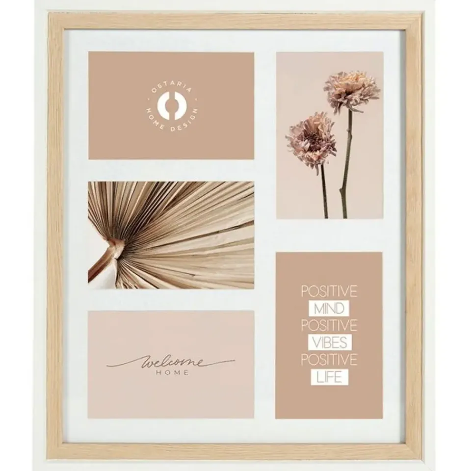 Collage fotolijst uit de NEO serie voor meerdere foto’s. Stel je foto’s tentoon met deze collage fotolijst in de kleur naturel hout met passe partout randen in de kleur wit. Deze moderne foto collage bestaat uit 5x fotolijstjes voor foto’s met afmetingen van 10 x 15 cm. Materiaal: hout/glas. Merk: Ostaria. Voorzien van ophangingen op deze op te hangen. Formaat: 34 x 40 cm. Wissellijst.