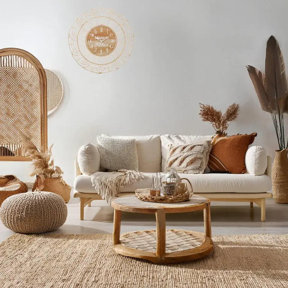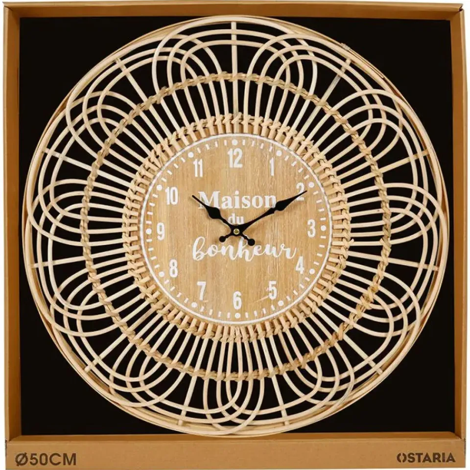 Waan je even op een zonnig eiland met deze Ibiza-style wandklok van Ostaria. Het luchtige rotan ontwerp in naturel tinten geeft meteen een gevoel van rust en warmte in huis. Met zijn diameter van 50 cm is hij groot genoeg om op te vallen, maar blijft hij toch subtiel dankzij het natuurlijke materiaal. “Maison du Bonheur” – het huis van geluk – staat speels op de wijzerplaat en maakt deze klok extra charmant. Perfect voor een boho, coastal of romantisch interieur. Voeding: AA batterij ( niet inbegrepen).