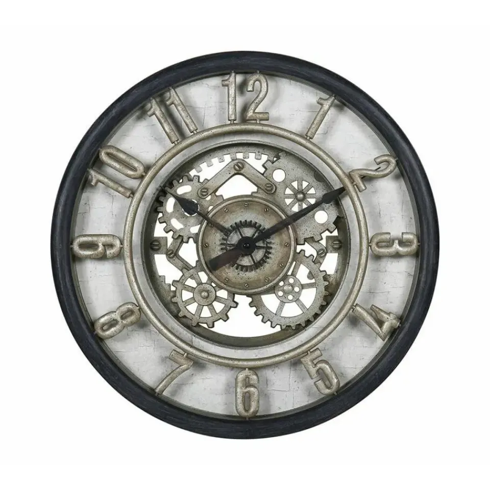 Wandklok Industrial Vintage Metal voor aan de muur/wand in de huis / kantoor / studeerkamer met een diameter van 51 cm en dikte 5.5 cm. Kleuren: zwart/grijs/transparant glas. Met normale cijfers. Aan de achterkant zit een ophanging(bevestigingsmateriaal niet inbegrepen). Materiaal: kunststof/glas. Voeding: 3x AA-batterij, niet inbegrepen. Gewicht: 1.7 kilo.