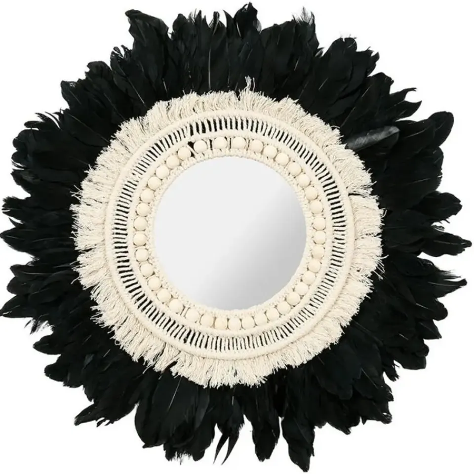 Breng de relaxte sfeer van Ibiza in huis met deze prachtige bohemian wandspiegel. De ronde spiegel is omlijst met natuurlijke veren in een zwart/wit tint en straalt een nonchalante, zomerse charme uit. Perfect voor liefhebbers van de boho en Ibiza stijl, en ideaal als eyecatcher in je hal, slaapkamer of woonkamer.