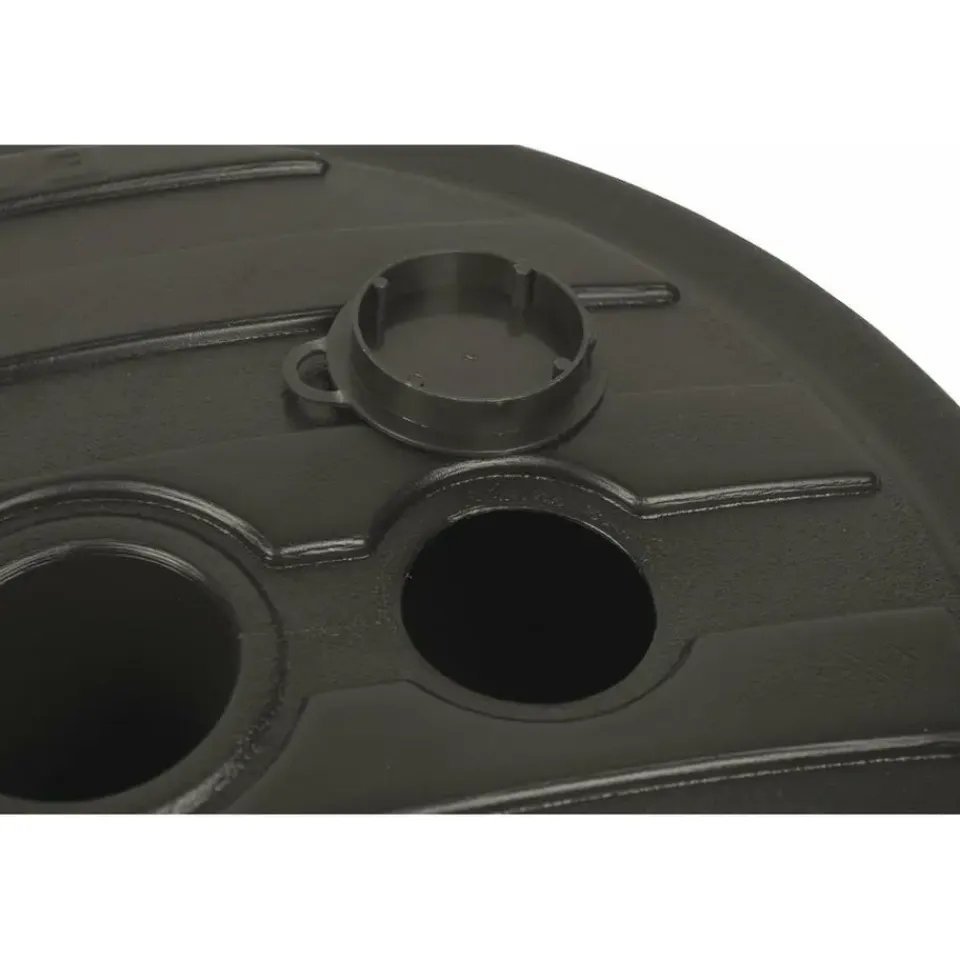 Ronde parasolvoet antraciet. Deze antraciet grijze parasolvoet heeft een afmeting van ongeveer 42 x 28 cm. De inhoud is 13 liter en de voet is gemaakt van polypropyleen. Er kan een stok in van circa 1,8 tot 3 cm. De parasolvoet dient zelf gevuld te worden met zand of water.