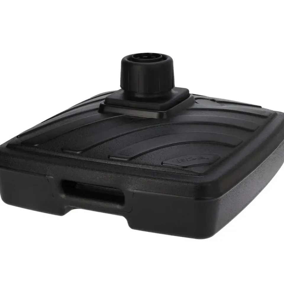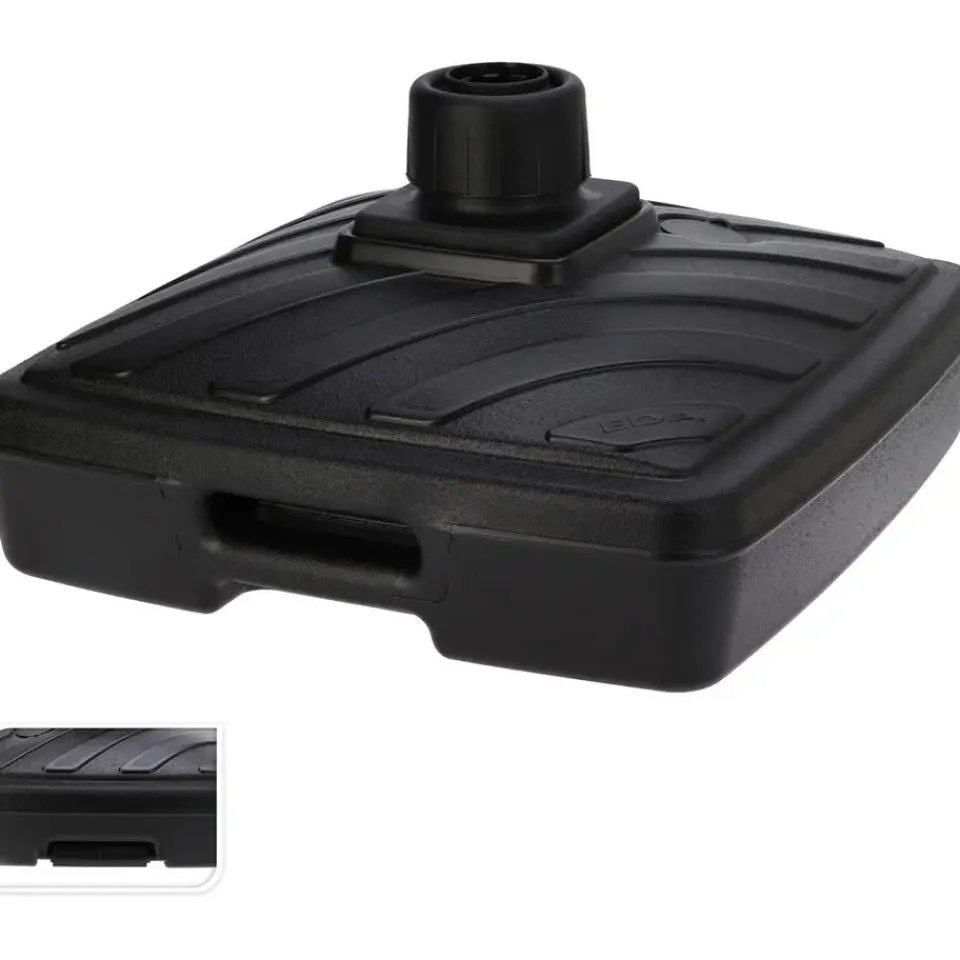 Vierkante parasolvoet Square, in de kleur antraciet grijs. Deze parasolvoet heeft een afmeting van ongeveer 55 x 31 cm. De vulbare inhoud is 40 liter en de voet is gemaakt van polypropyleen. Er kan een stok in van circa 38 tot 56 mm. De parasolvoet dient zelf gevuld te worden met zand of water.