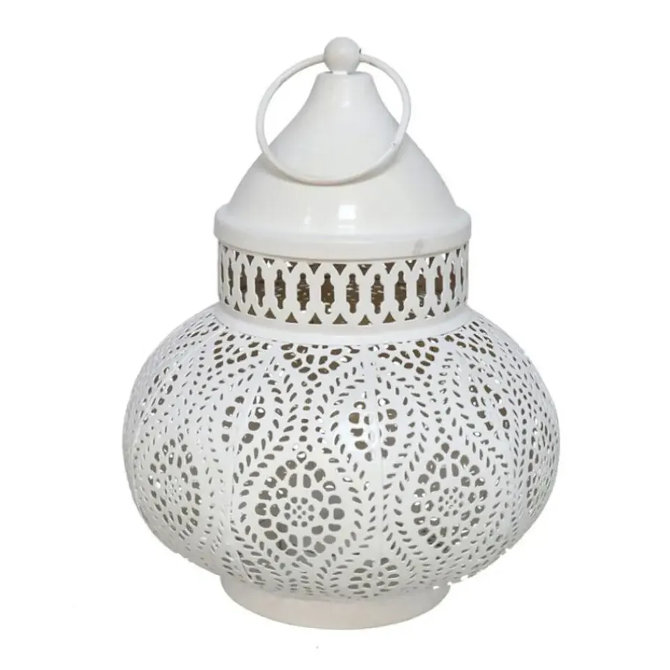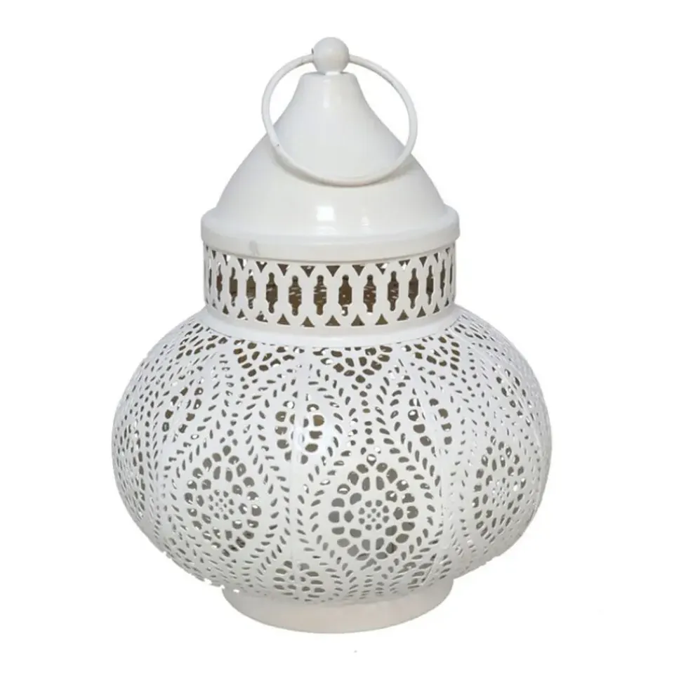 Tuin decoratie lantaarn in mooie Marokkaanse of 1001 nacht thema sfeer stijl. Geschikt voor kaarsen. Kleuren: wit/goud. Afmetingen: D15 x H19 cm. Gemaakt van decoratief metaal. Buitenverlichting, sfeer verlichting. Per 2 stuks in verschillende formaten ziet het er echt fantastisch uit op tafel.