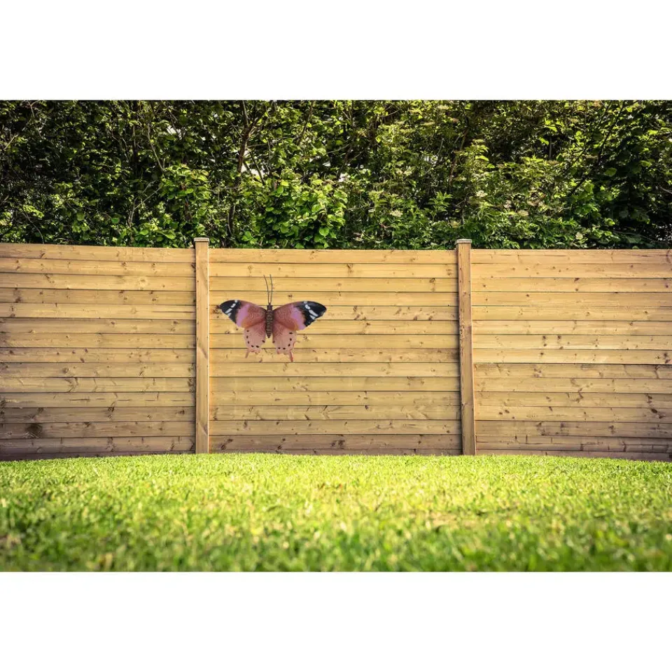Een roestbruin met roze vlinder, geschikt voor decoratie in uw tuin of aan uw schutting. Met ophangoogje. Afmeting: ca. 44 x 31 cm. Materiaal: metaal. Tuindecoratie muur/schutting ophang vlinders van metaal.