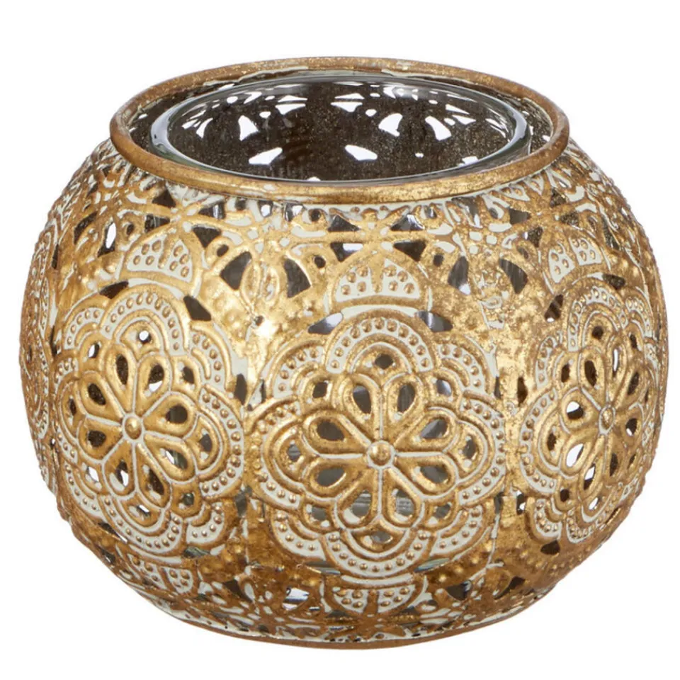 Sfeervolle goudkleurige waxinelichthouder met een prachtig mandala-patroon. Deze elegante houder zorgt voor een warme, stijlvolle gloed in huis en past perfect bij elk interieur. Geschikt voor standaard waxinelichtjes (niet inbegrepen, maar wel verkrijgbaar).