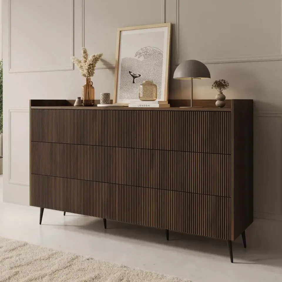 Ladekast Asty is gemaakt in een donker eiken kleur. De opbergkast beschikt over 6 lades die openen met het push to open systeem. De voorkant heeft een latten patroon. Het meubel heeft een moderne uitstraling en staat op metalen poten. Het meubel wordt ongemonteerd geleverd. Je dient het dus met behulp van de bijgeleverde handleiding zelf in elkaar te zetten.