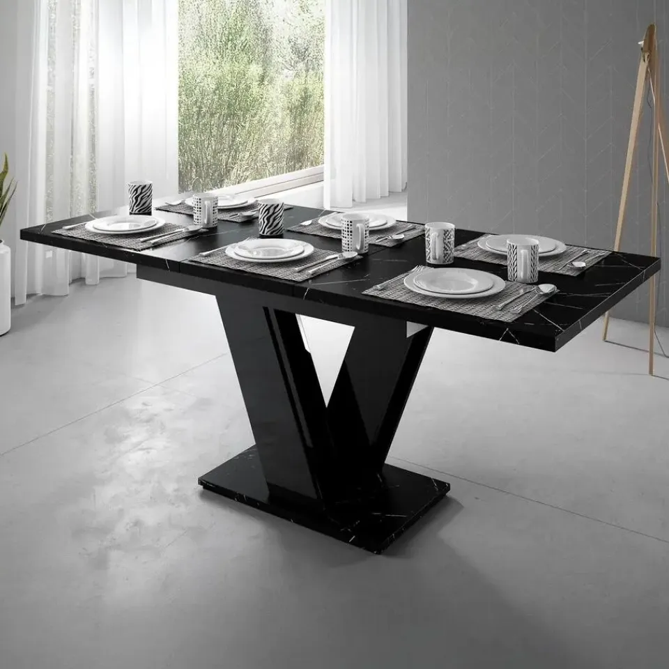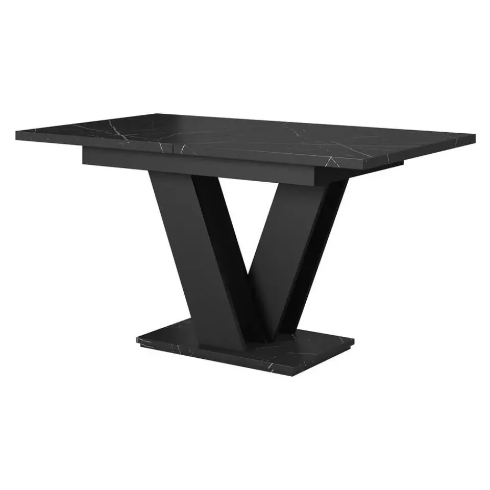 Eetkamertafel Moris is een rechthoekige eettafel in zwart marmerlook en staat op een V-poot. De tafel is uitschuifbaar van 120 cm tot 160 cm. Hierdoor is de tafel geschikt voor 4 tot 6 personen. Het meubel wordt ongemonteerd geleverd. Je dient het dus met behulp van de bijgeleverde handleiding zelf in elkaar te zetten.