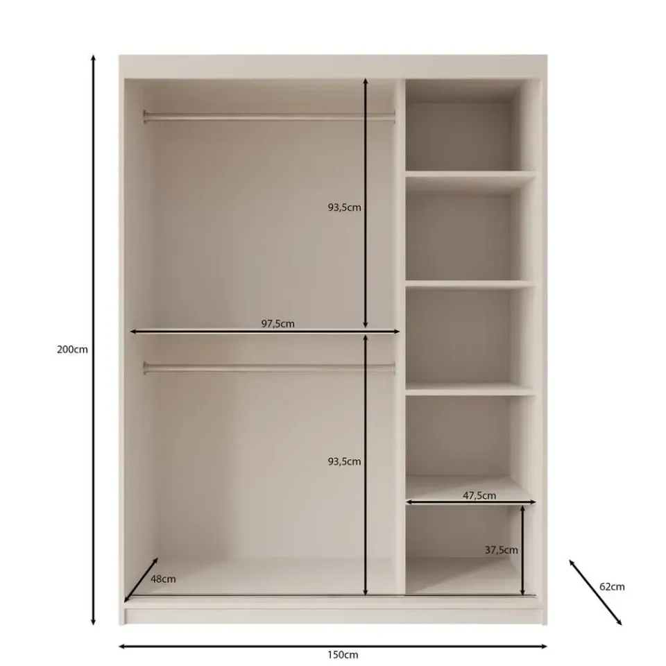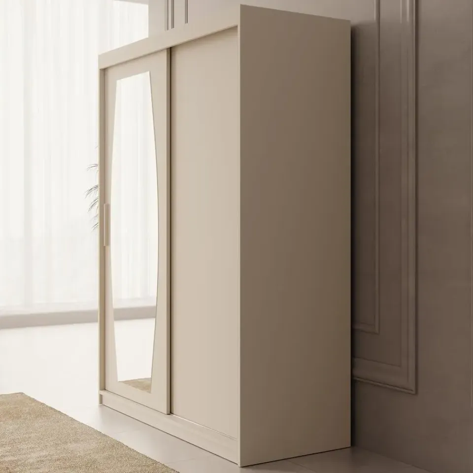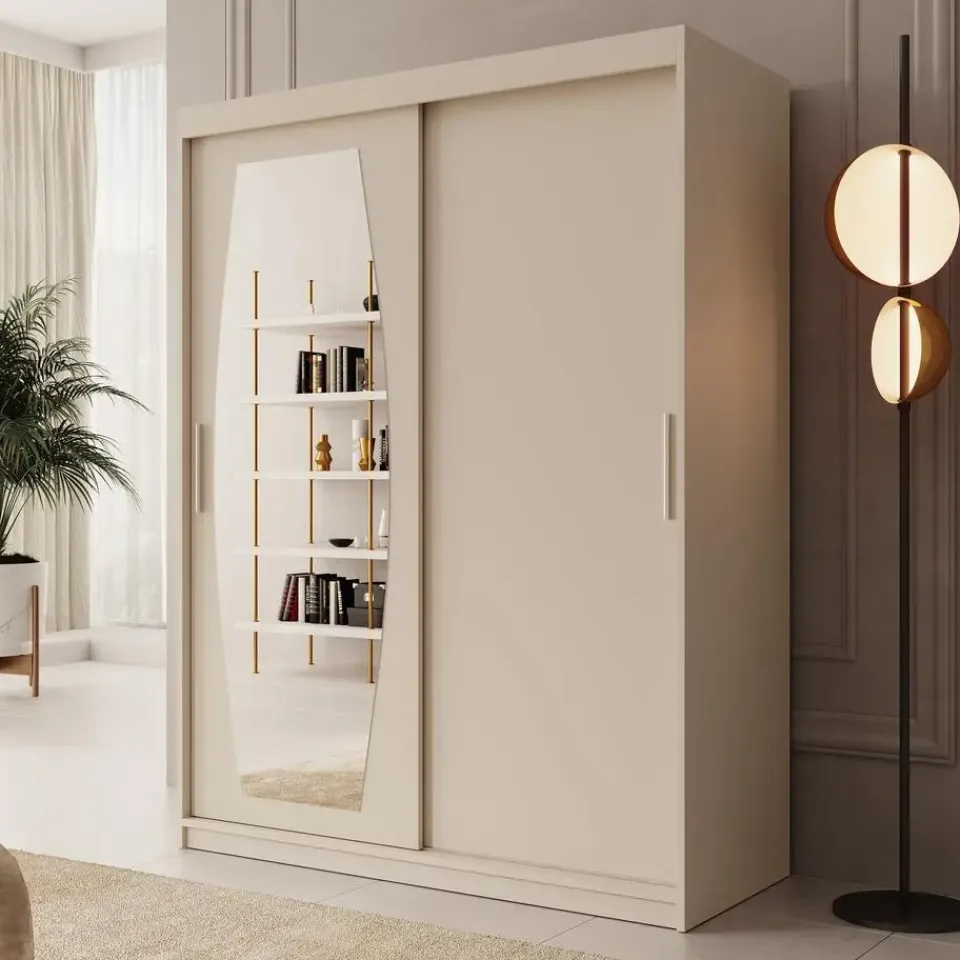 Kledingkast Azai heeft 2 schuifdeuren die openen met handgrepen. De linkerdeur is voorzien van een spiegel met een elegante, organische vorm. De binnenkant bestaat uit 5 opbergvakken en 2 kledingroedes. De kast is uitgevoerd in de kleur beige. Het meubel wordt ongemonteerd geleverd. Je dient het dus met behulp van de bijgeleverde handleiding zelf in elkaar te zetten.
