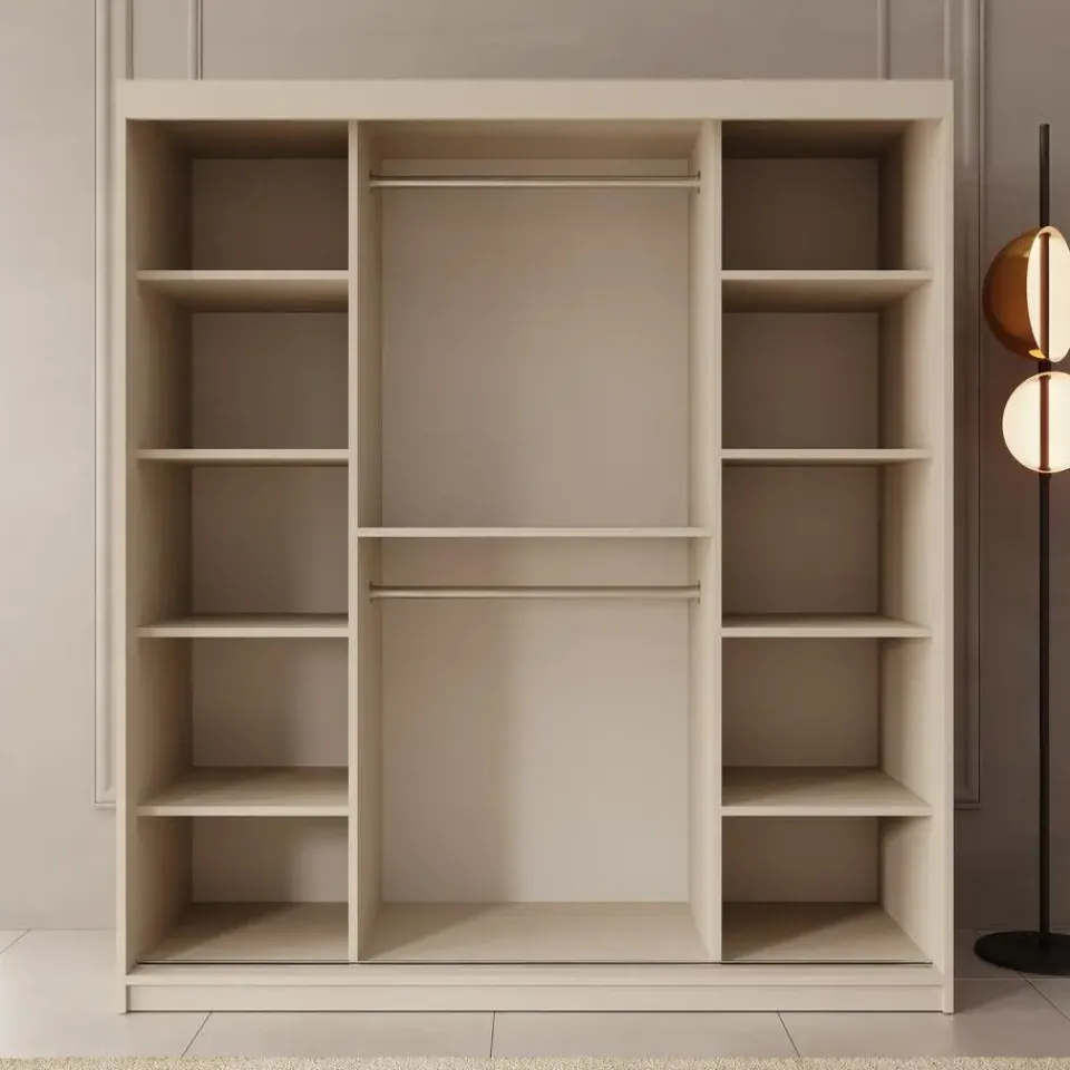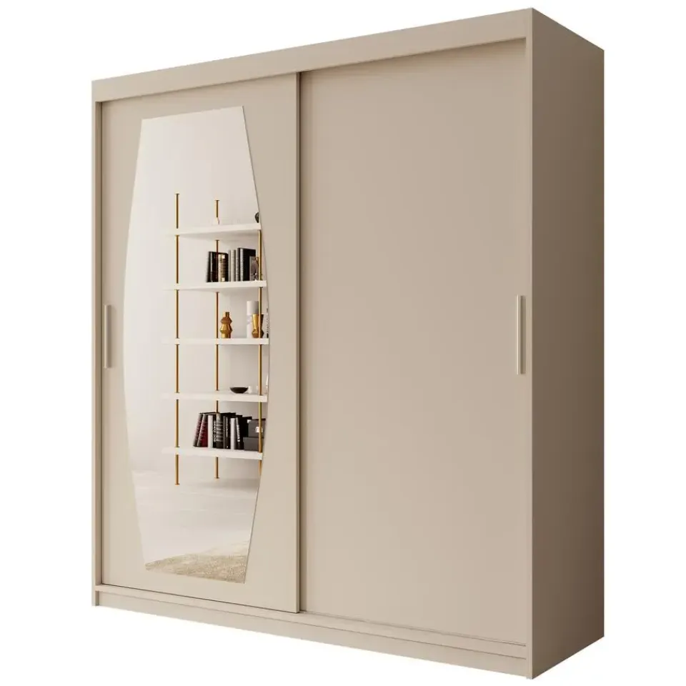 Kledingkast Azai heeft 2 schuifdeuren die openen met handgrepen. De linkerdeur is voorzien van een spiegel met een elegante, organische vorm. De binnenkant bestaat uit 10 opbergvakken en 2 kledingroedes. De kast is uitgevoerd in de kleur beige. Het meubel wordt ongemonteerd geleverd. Je dient het dus met behulp van de bijgeleverde handleiding zelf in elkaar te zetten.