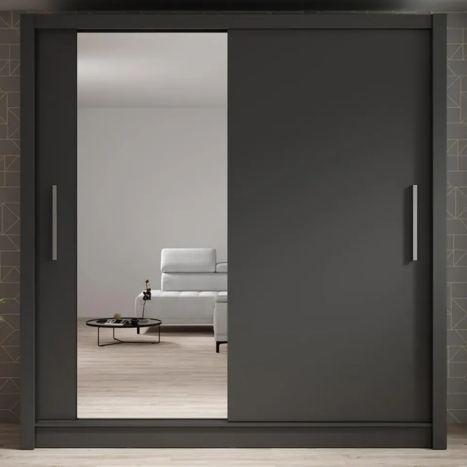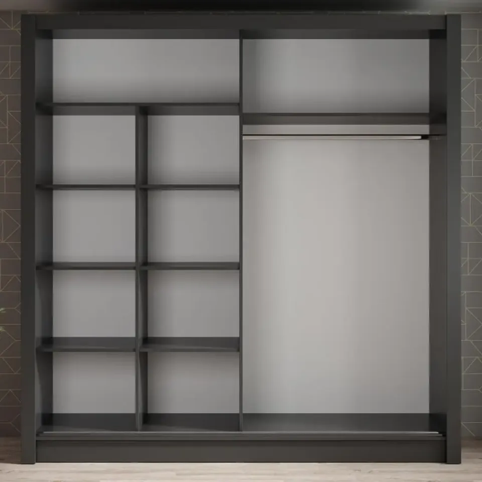 Kledingkast Bazarre beschikt over 2 schuifdeuren die openen met zilverkleurige handgrepen. De linkerdeur is voorzien van een spiegel. De binnenkant bestaat uit 10 opbergvakken en 1 kledingroede. De kast is uitgevoerd in grijze kleur. Het meubel wordt ongemonteerd geleverd. Je dient het dus met behulp van de bijgeleverde handleiding zelf in elkaar te zetten.