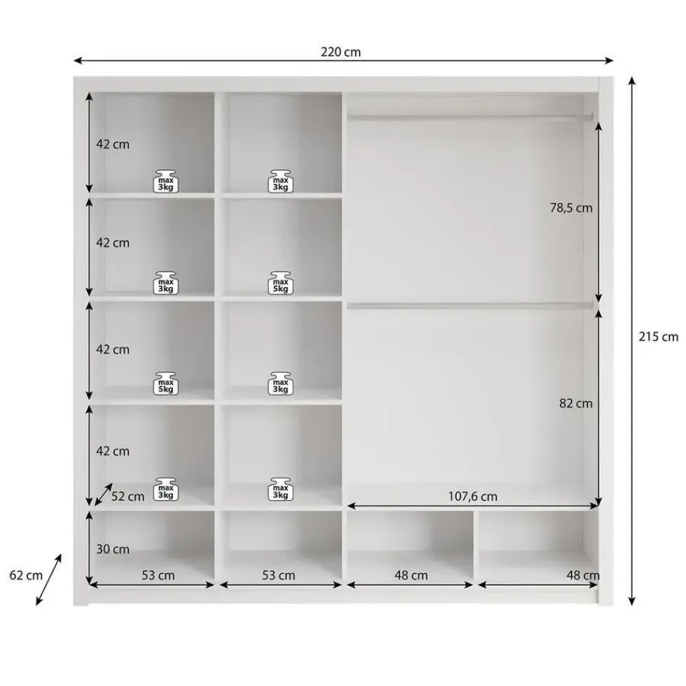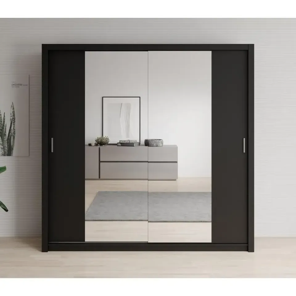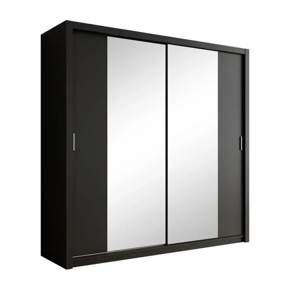 Kledingkast Blake beschikt over 2 schuifdeuren die te openen zijn met zilverkleurige handgrepen. Op beide deuren zit een handige spiegel. De binnenkant bestaat uit 2 kledingroedes en 12 open vakken. Het meubel wordt ongemonteerd geleverd. Je dient het dus met behulp van de bijgeleverde handleiding zelf in elkaar te zetten.