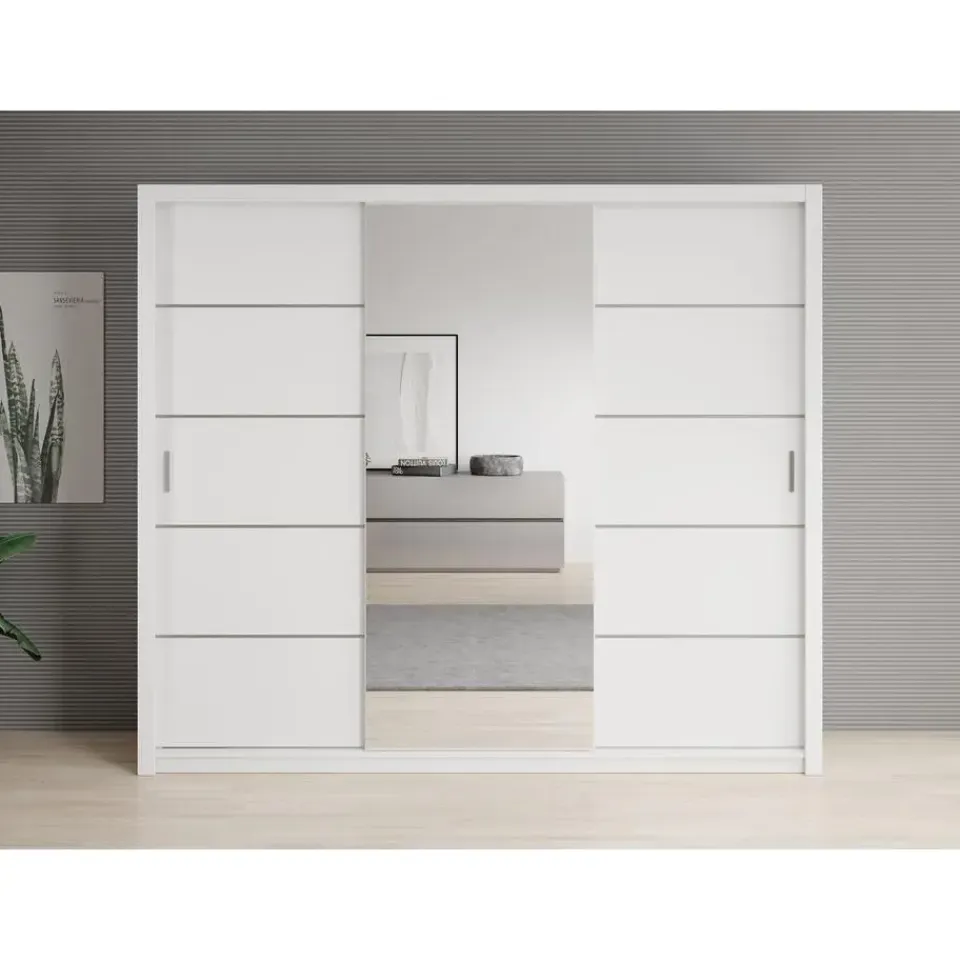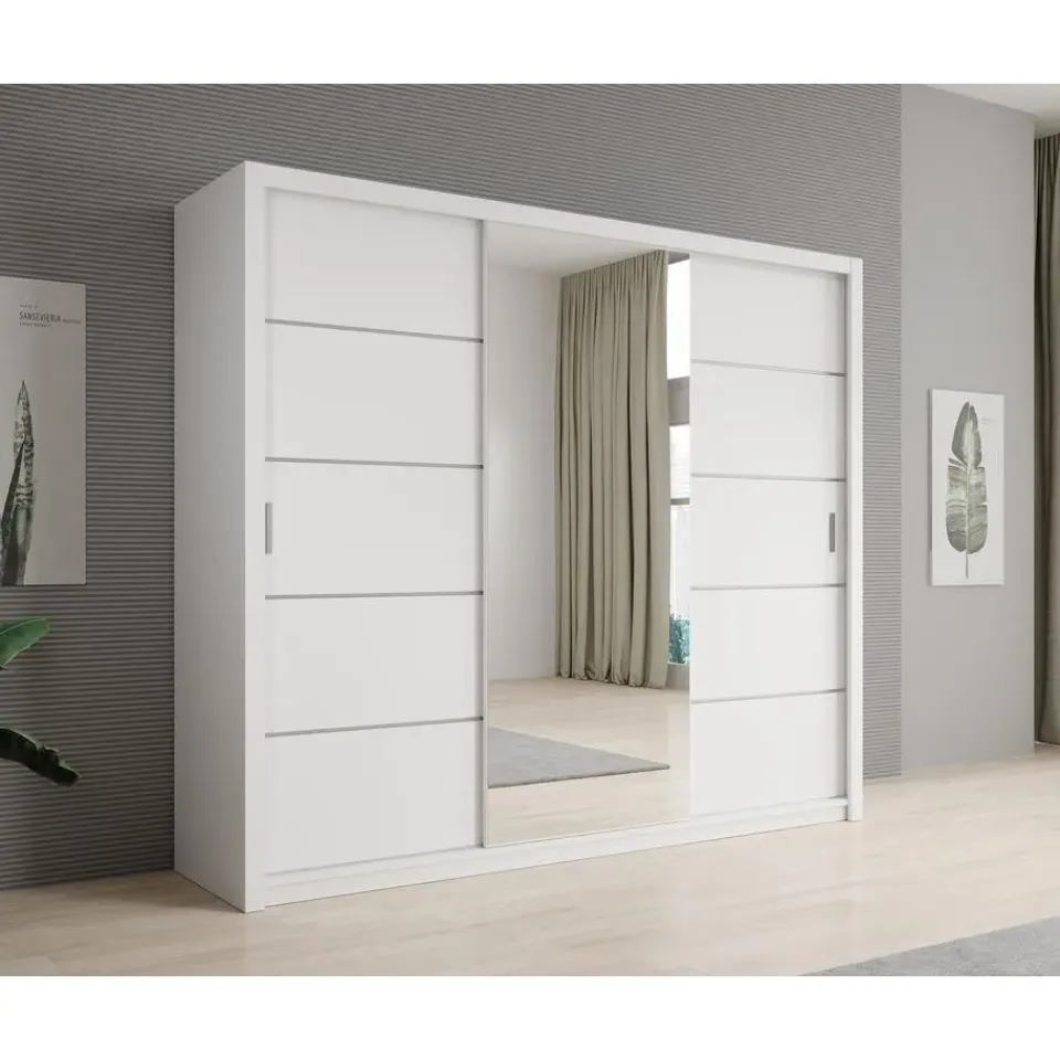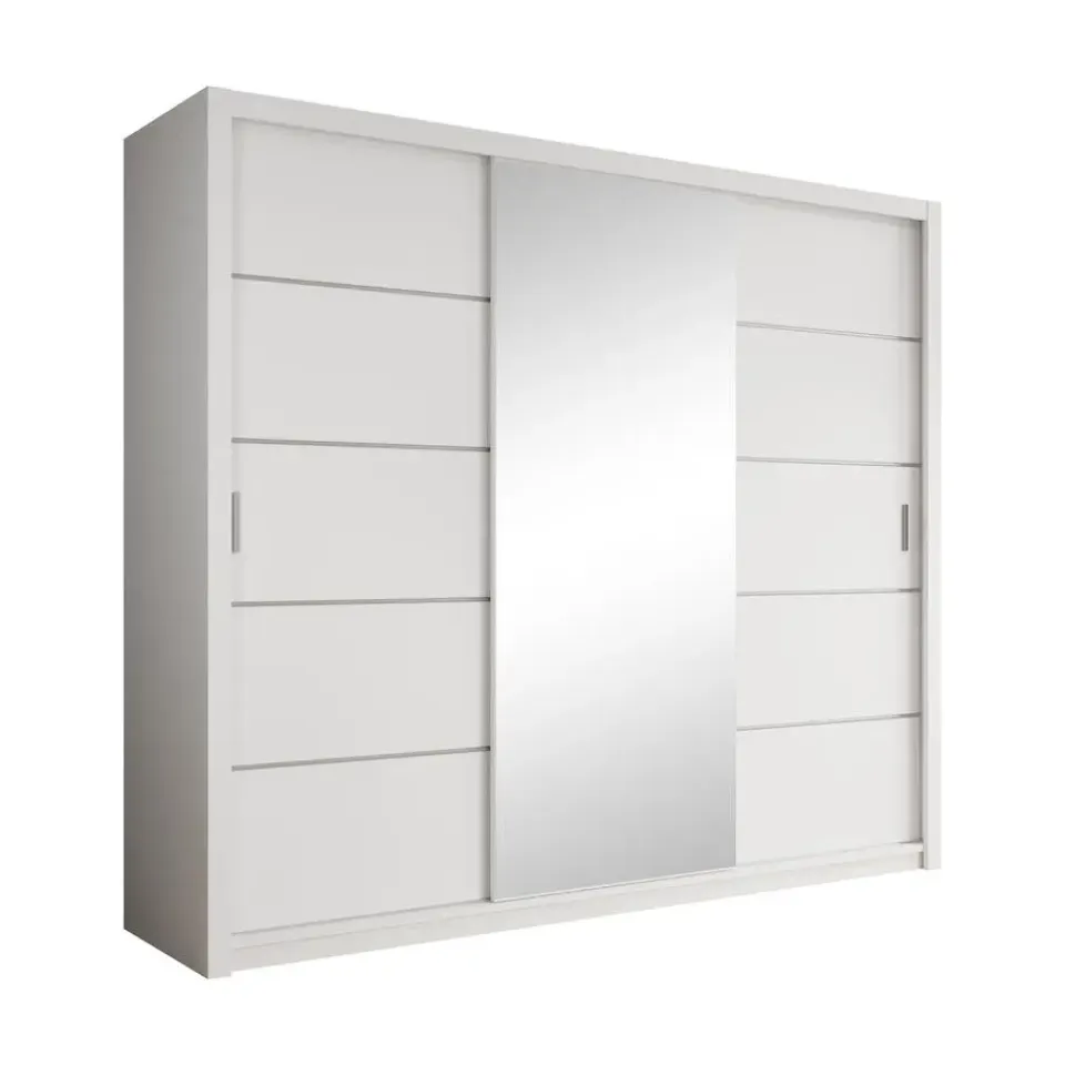 Kledingkast Blake beschikt over 2 schuifdeuren die te openen zijn met zilverkleurige handgrepen. Op de middelste deur is een handige spiegel geplaatst. De binnenkant bestaat uit 2 kledingroedes en 10 open vakken. De horizontale strepen zijn plakstrips. Het meubel wordt ongemonteerd geleverd. Je dient het dus met behulp van de bijgeleverde handleiding zelf in elkaar te zetten.