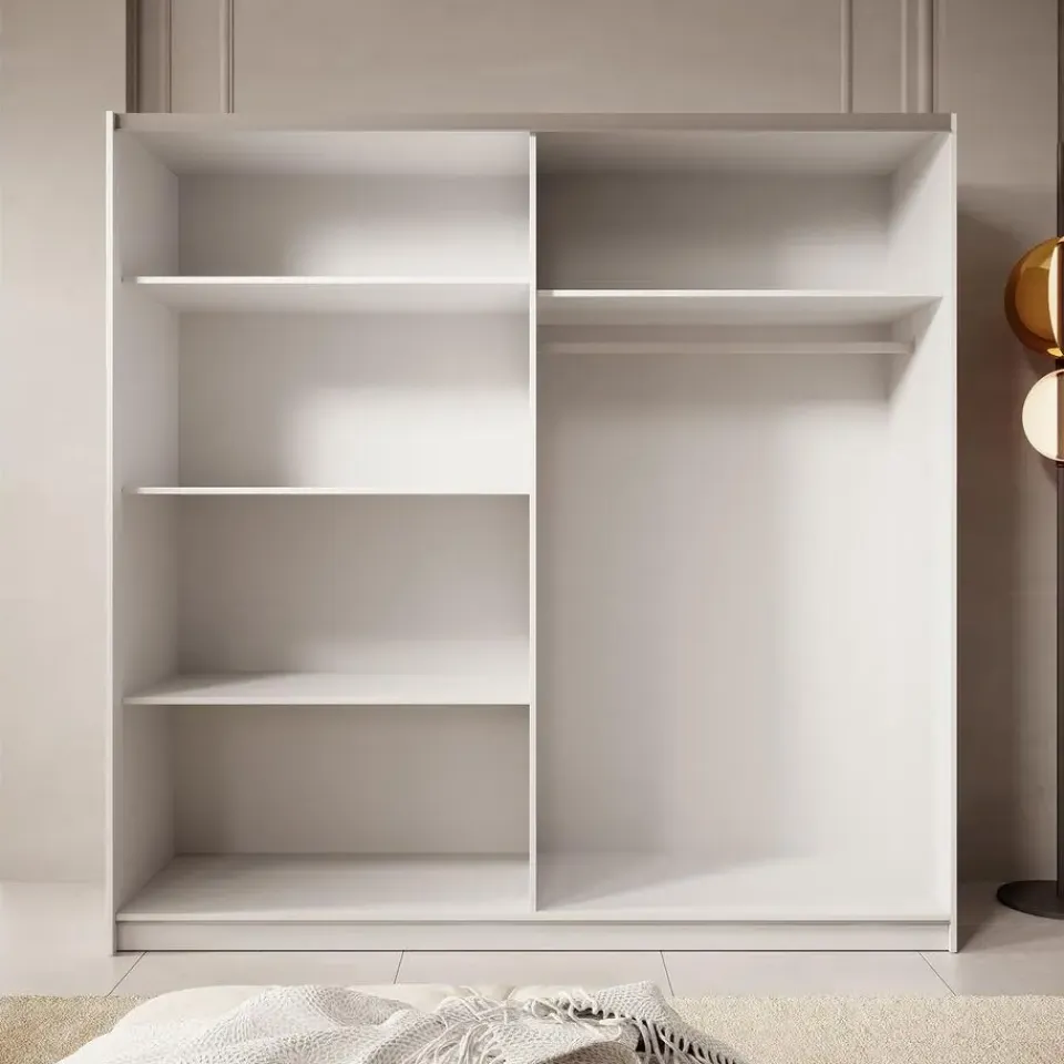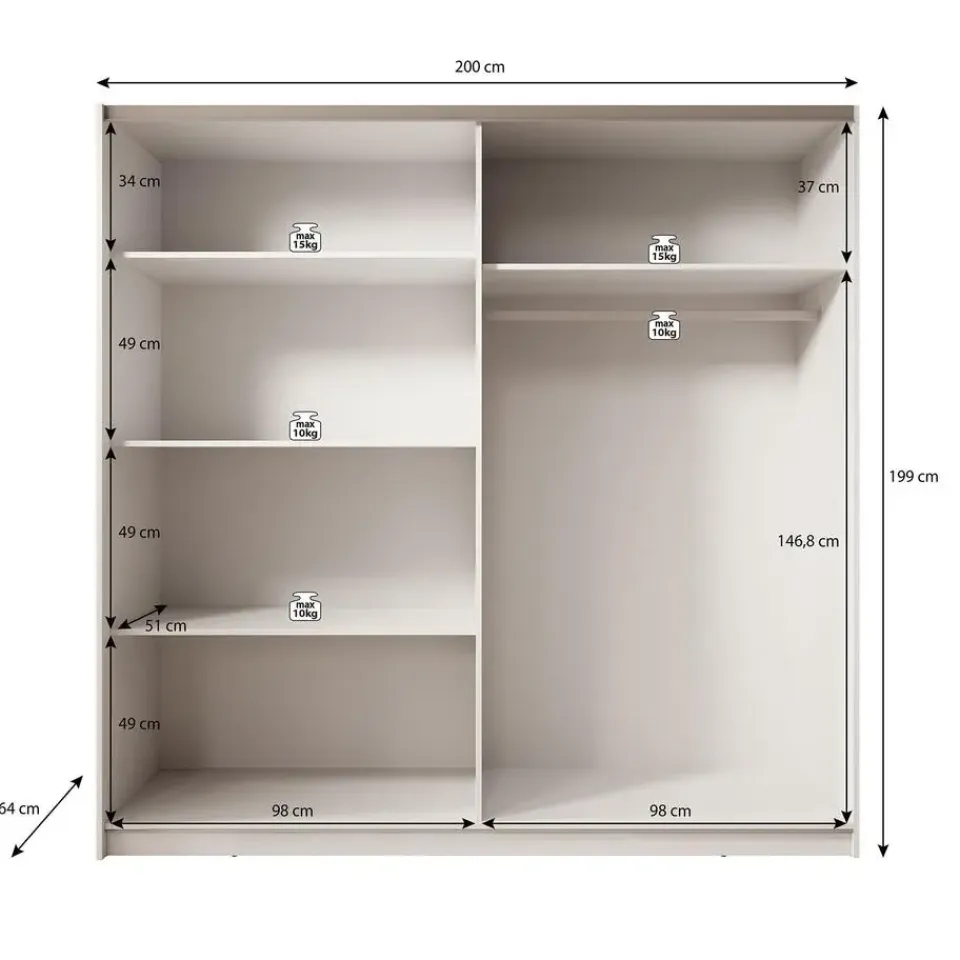 Kledingkast Boets is voorzien van 2 schuifdeuren. Eén deur is gedeeltelijk voorzien van een handige spiegel, de andere deur beschikt over eiken latjes. De binnenkant bestaat uit 5 opbergvakken en een kledingroede. Het meubel wordt ongemonteerd geleverd. Je dient het dus met behulp van de bijgeleverde handleiding zelf in elkaar te zetten.