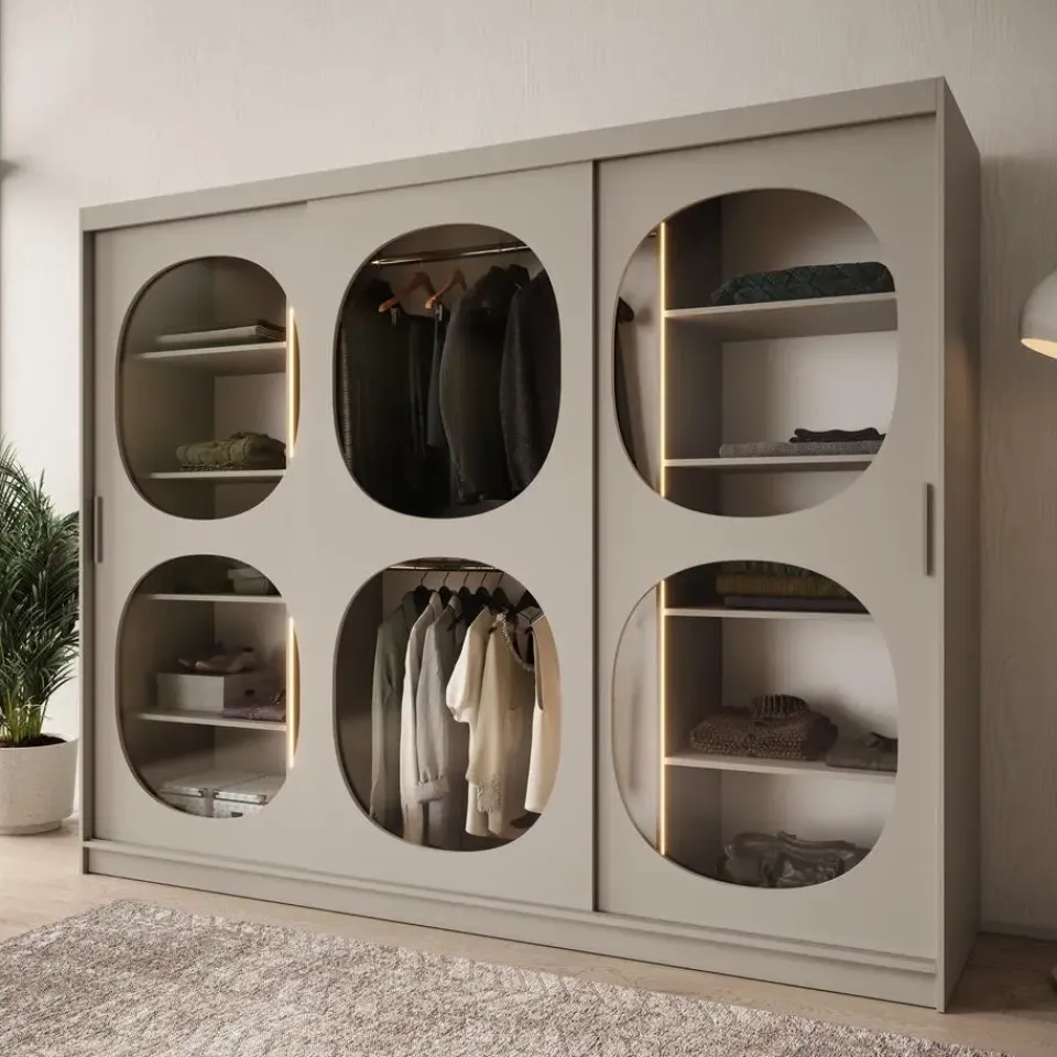 Kledingkast Bravanti beschikt over 3 schuifdeuren die openen met zilverkleurige handgrepen. Deze deuren zijn voorzien van rookglas in ronde vorm. De binnenkant bestaat uit 2 kledingroedes en 10 opbergvakken. Wordt geleverd inclusief LED-verlichting. Het meubel wordt ongemonteerd geleverd. Je dient het dus met behulp van de bijgeleverde handleiding zelf in elkaar te zetten.