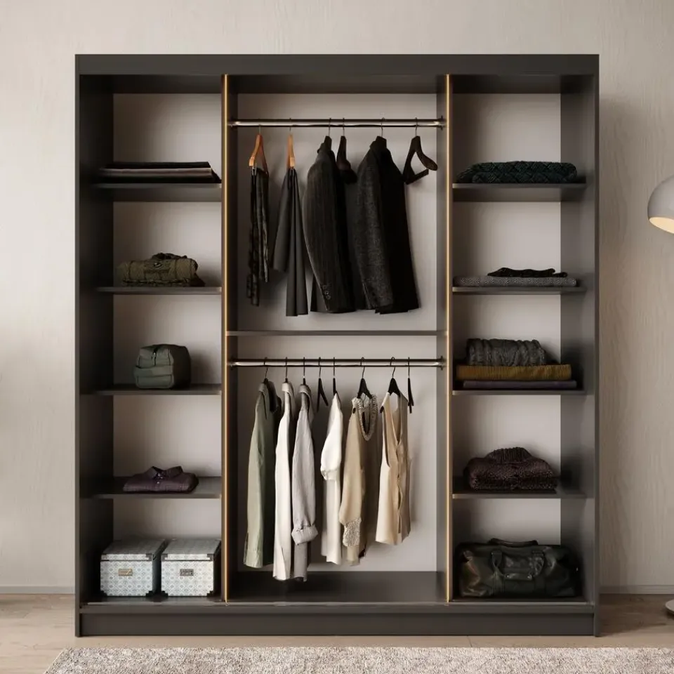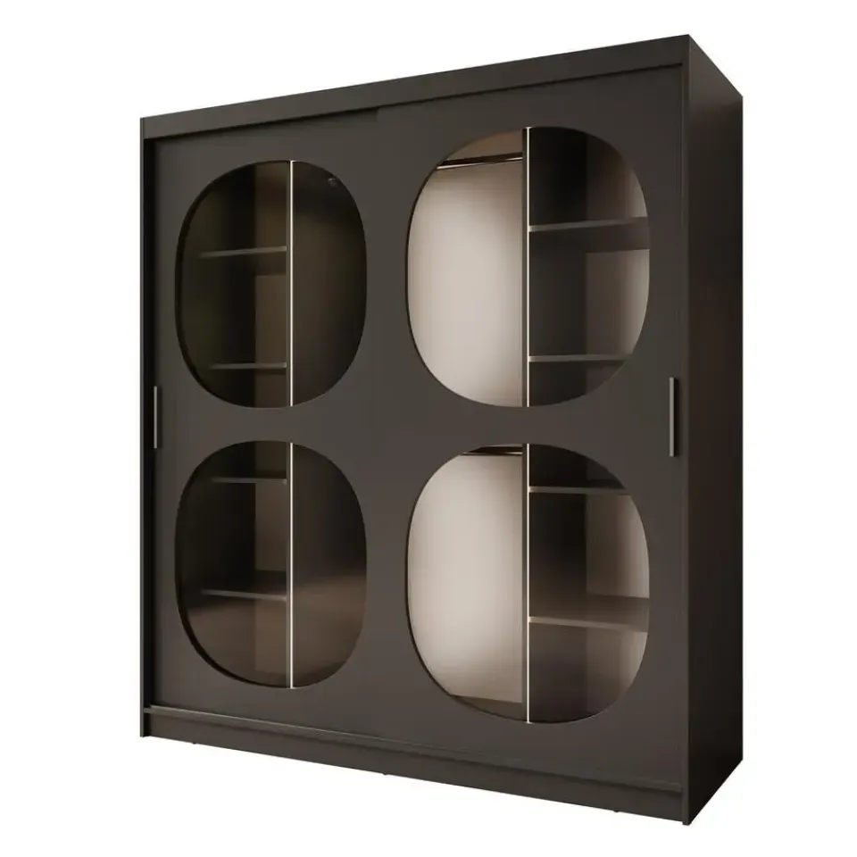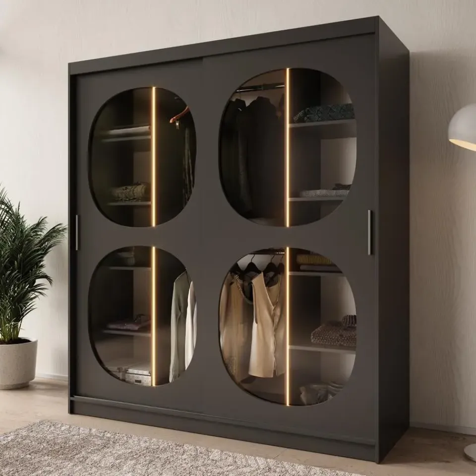 Kledingkast Bravanti beschikt over 2 schuifdeuren die openen met zilverkleurige handgrepen. Deze deuren zijn voorzien van rookglas in ronde vorm. De binnenkant bestaat uit 2 kledingroedes en 10 opbergvakken. Wordt geleverd inclusief LED-verlichting. Het meubel wordt ongemonteerd geleverd. Je dient het dus met behulp van de bijgeleverde handleiding zelf in elkaar te zetten.