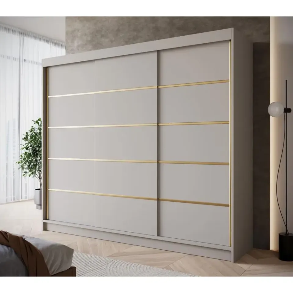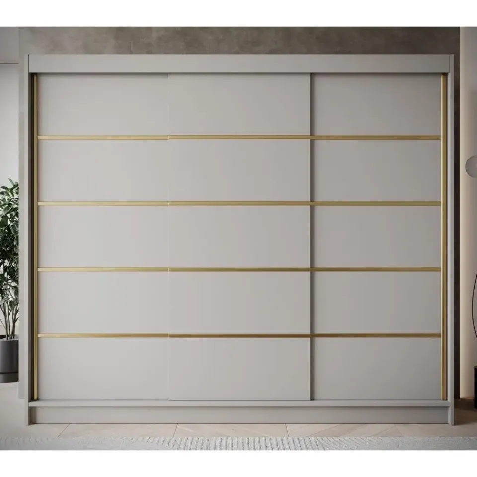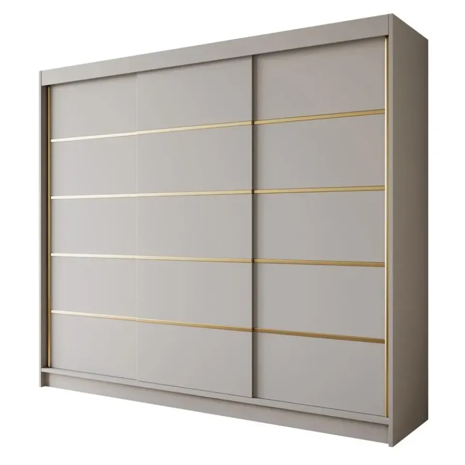 Kledingkast Eagle is voorzien van 3 schuifdeuren. De kast is uitgevoerd in beige met goudkleurige details. De binnenkant bestaat uit 11 opbergvakken en 1 kledingroede. De garderobekast heeft een moderne uitstraling. Het meubel wordt ongemonteerd geleverd. Je dient het dus met behulp van de bijgeleverde handleiding zelf in elkaar te zetten.
