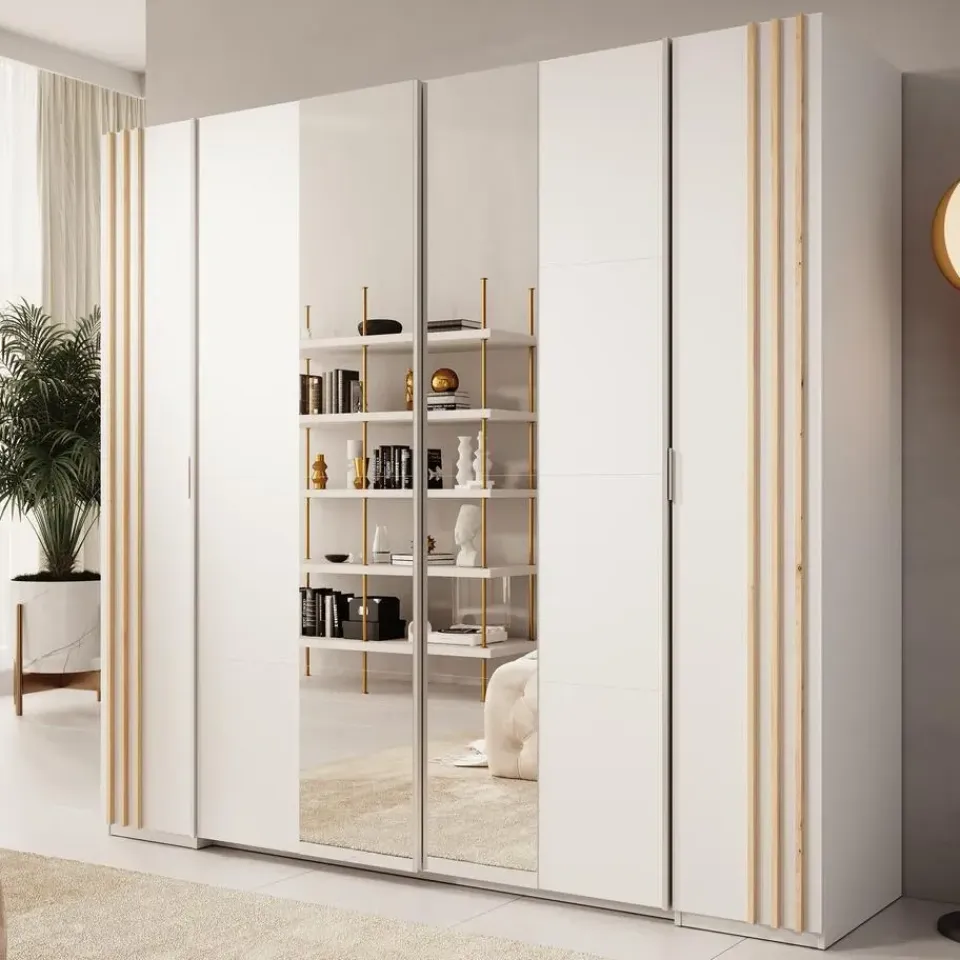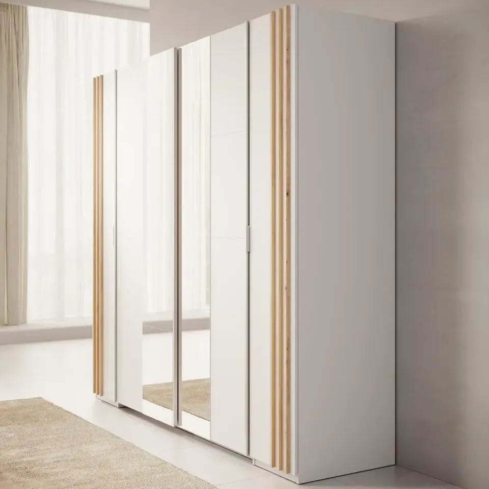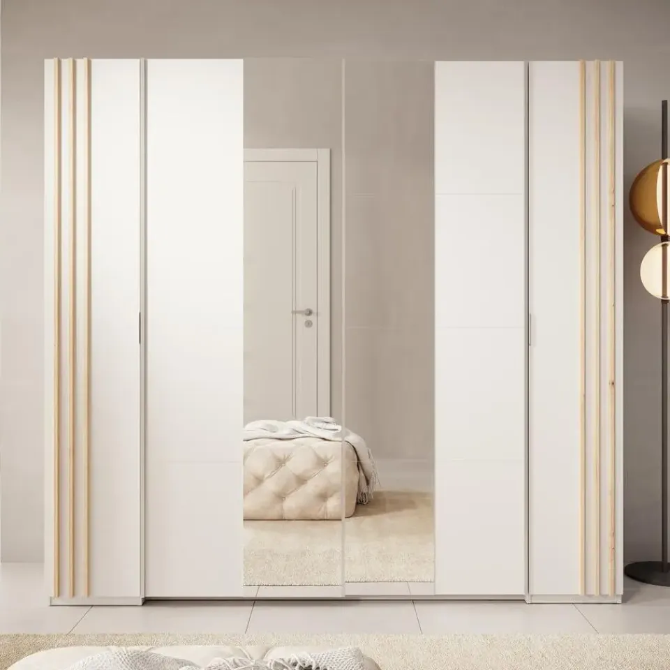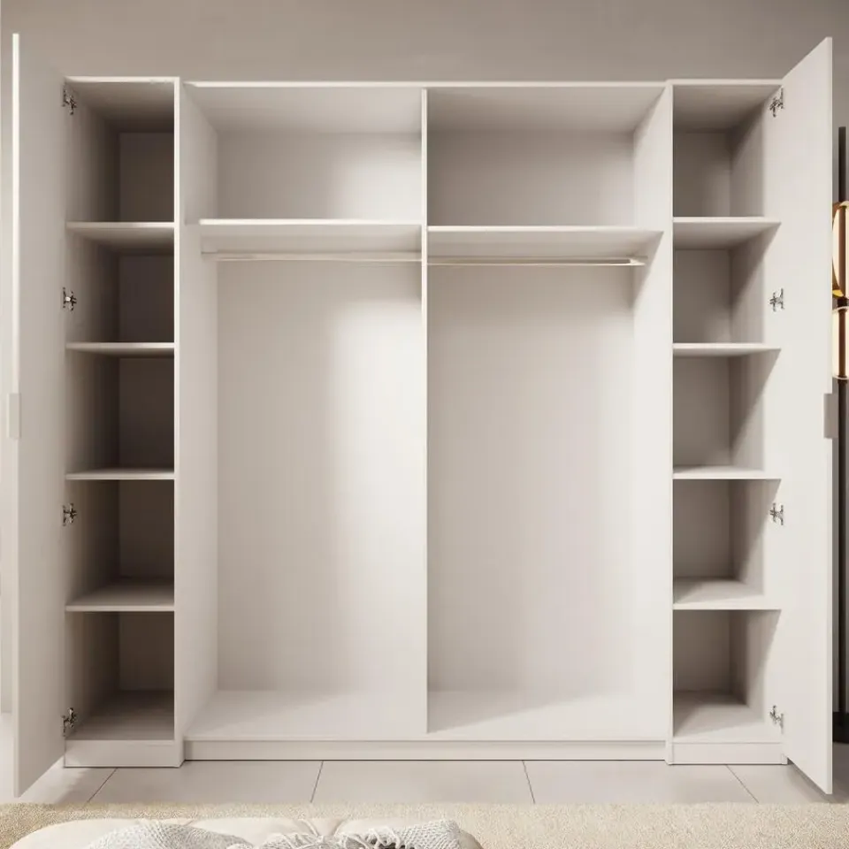 Kledingkast Franklin beschikt over 2 greeploze schuifdeuren en 2 scharnierdeuren die openen met zilverkleurige handgrepen. Op de middelste deuren zit een spiegel. De binnenkant bestaat uit 12 opbergvakken en 2 kledingroedes. Uitgevoerd in wit. Het meubel wordt ongemonteerd geleverd. Je dient het dus met behulp van de bijgeleverde handleiding zelf in elkaar te zetten.