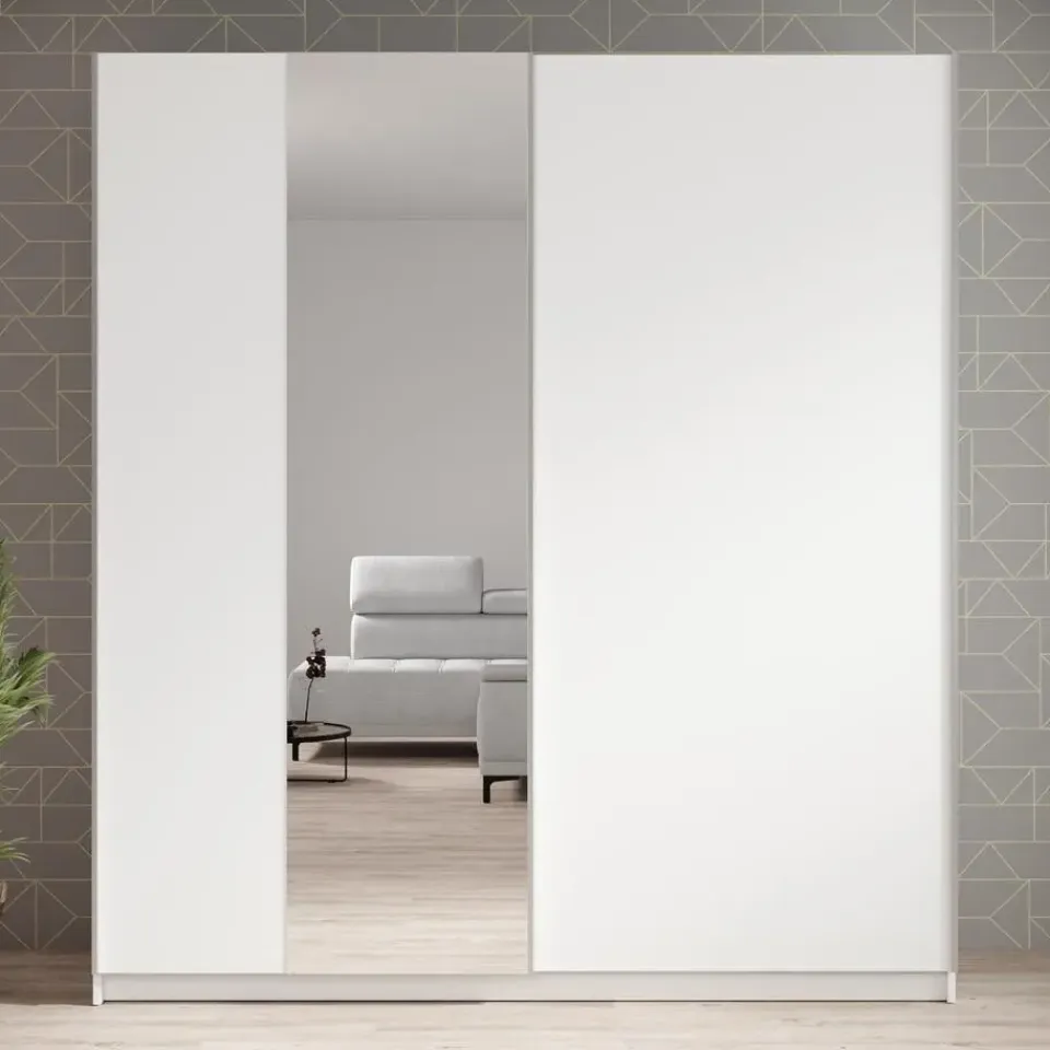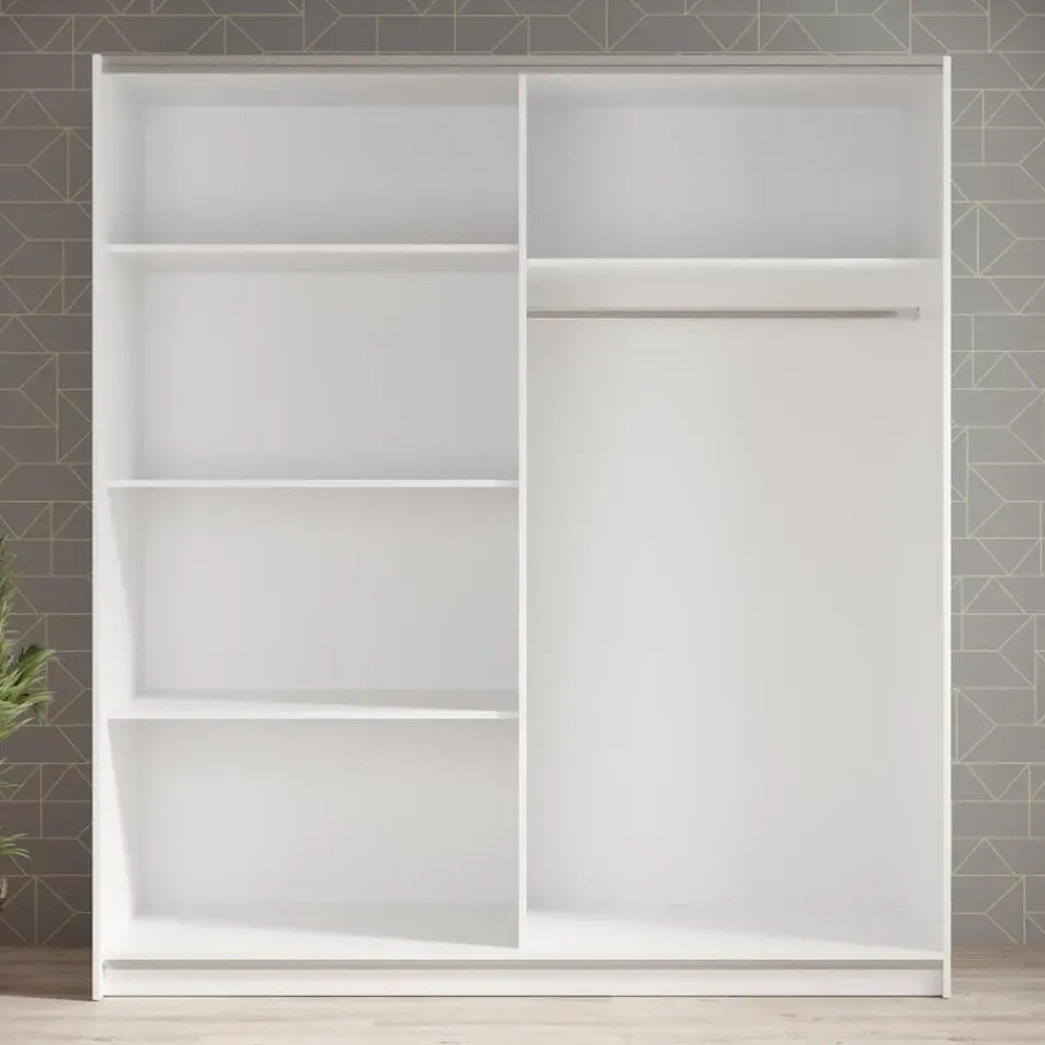 Kledingkast Ganaro beschikt over 2 schuifdeuren. Dankzij het schuifdeursysteem bespaar je ruimte in de kamer. De linkerdeur heeft een spiegel. De binnenkant bestaat uit 5 opbergvakken en 1 kledingroede. De kast is uitgevoerd in de kleur wit. Het meubel wordt ongemonteerd geleverd. Je dient het dus met behulp van de bijgeleverde handleiding zelf in elkaar te zetten.