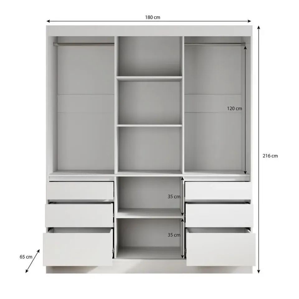 Kledingkast Henry beschikt over 3 schuifdeuren waarvan de middelste voorzien is van een spiegel. De binnenkant bestaat uit 2 kledingroedes en 5 opbergvakken. Ten slotte zijn er nog 6 lades te vinden. Het meubel wordt ongemonteerd geleverd. Je dient het dus met behulp van de bijgeleverde handleiding zelf in elkaar te zetten.