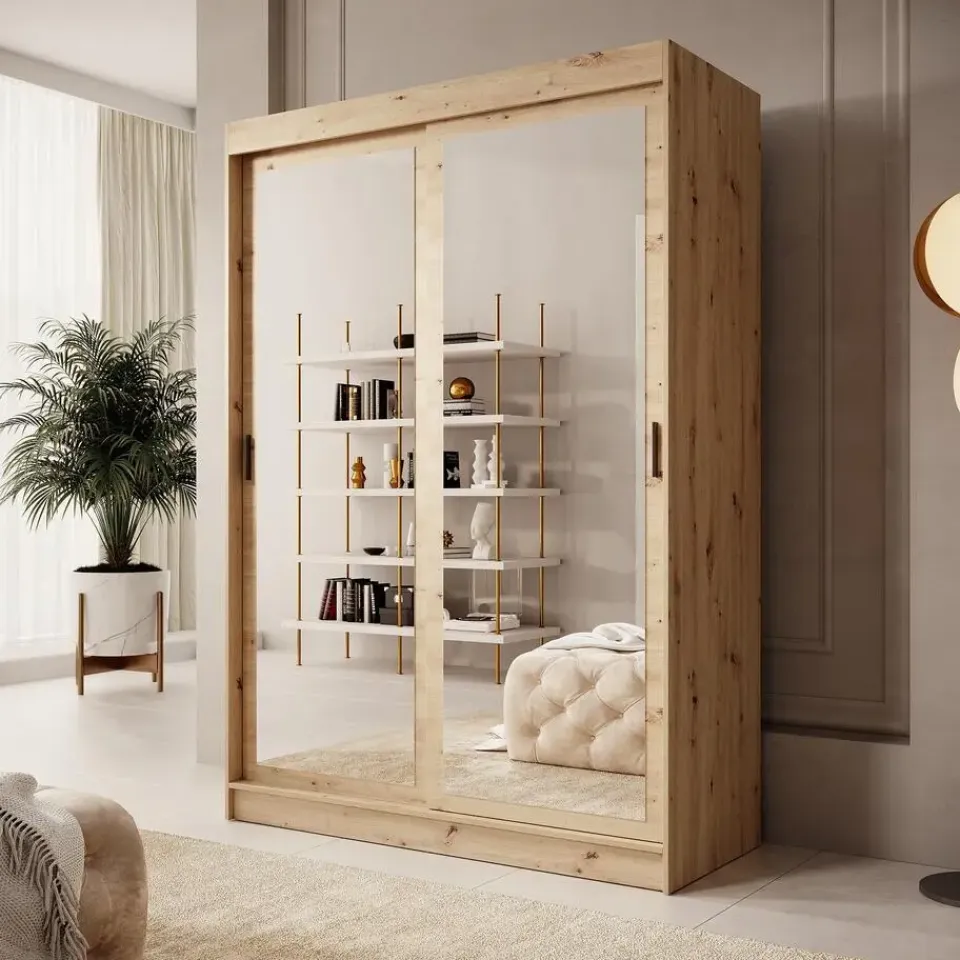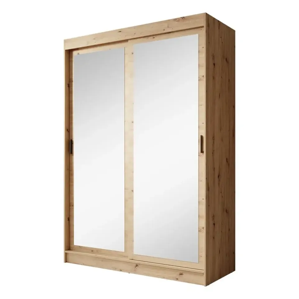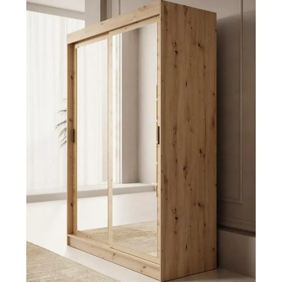 Kledingkast Mammock is een garderobekast uitgevoerd in eiken kleur. De kledingkast heeft 2 schuifdeuren die openen met zwarte handgrepen waarachter 1 kledingroede en 5 opbergvakken zitten. Op beide deuren is een spiegel geplaatst. Het meubel wordt ongemonteerd geleverd. Je dient het dus met behulp van de bijgeleverde handleiding zelf in elkaar te zetten.