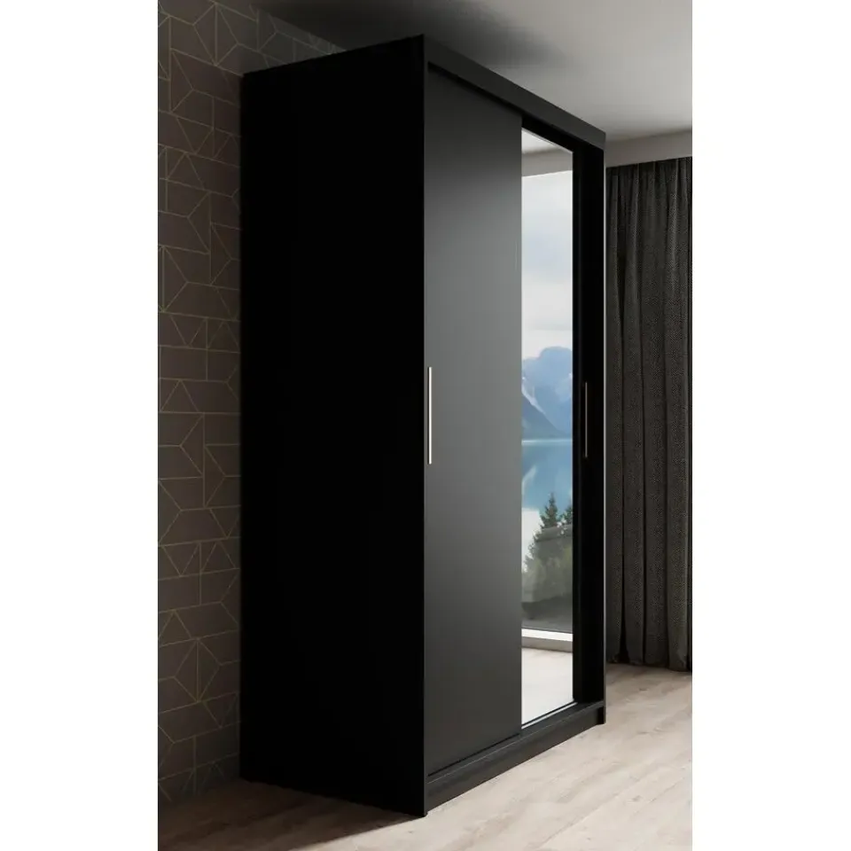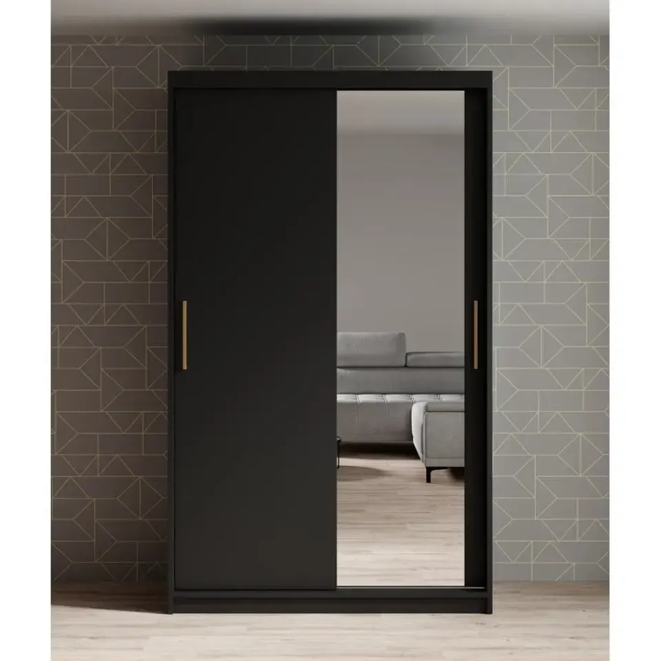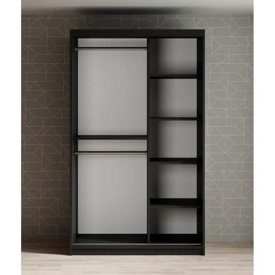 Kledingkast Mandalin beschikt over 2 schuifdeuren die te openen zijn met goudkleurige handgrepen. De rechterdeur is voorzien van een spiegel. De binnenkant bestaat uit 2 kledingroedes en 5 opbergvakken. Het meubel wordt ongemonteerd geleverd. Je dient het dus met behulp van de bijgeleverde handleiding zelf in elkaar te zetten.