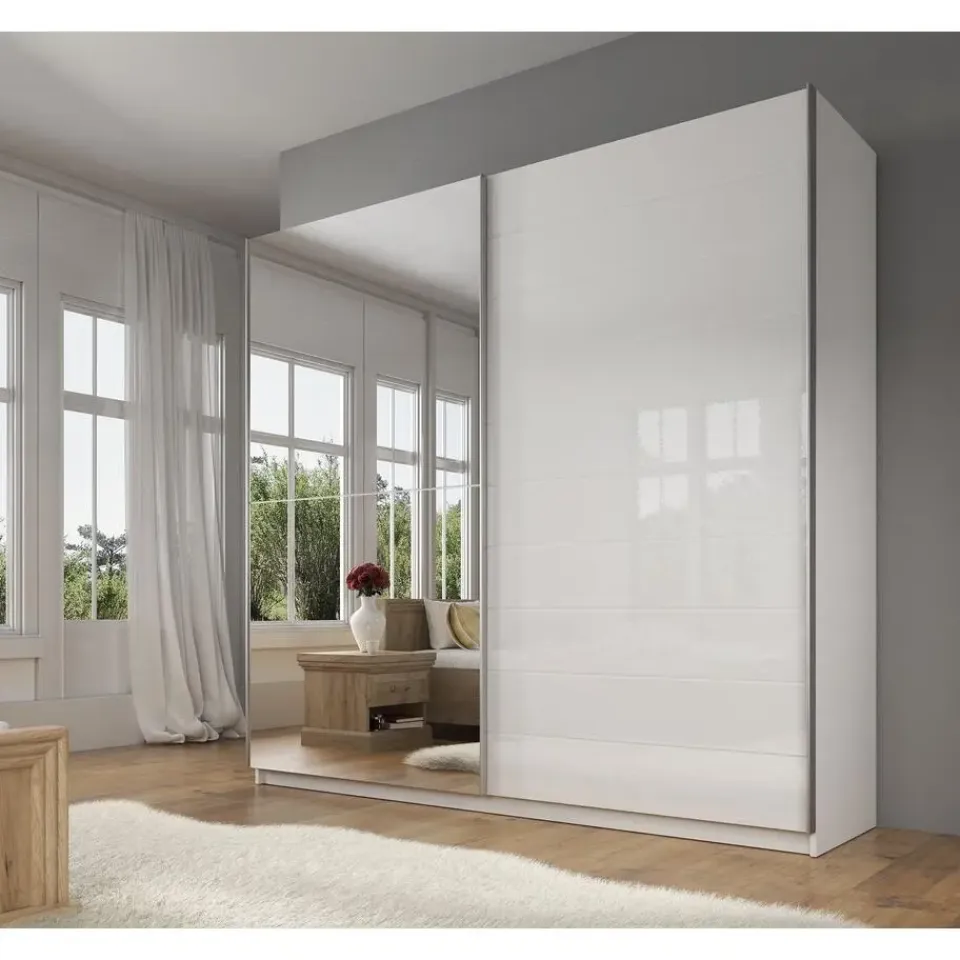 Kledingkast Mariah beschikt over 2 schuifdeuren waarvan de linker een spiegel heeft. De rechterdeur is uitgevoerd in hoogglans wit. De binnenkant bestaat uit 10 open vakken en 2 kledingroedes. Het meubel wordt ongemonteerd geleverd. Je dient het dus met behulp van de bijgeleverde handleiding zelf in elkaar te zetten.